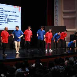 出囃子の時点で歓声が起こったのは、中国でも人気のチョコレートプラネット。お馴染みMr.マジカルの「エンターテインメントショー」のコントでは、IKKOのモノマネやTT兄弟のアドリブも飛び出し、笑いで会場が一つになった。GABEZは前日に引き続き、客席を巻き込む拍手の演出に会場は大きく盛り上がり。後半、長方形の枠だけでオフィスでの仕事を表現したパントマイムの作品には、動作一つひとつに驚きの声が上がる一幕も。最後は出演者全員でのゲームコーナーが企画され、賞品の上海蟹をかけて記憶ダンスゲームやピンポン玉リレーで競い合った。