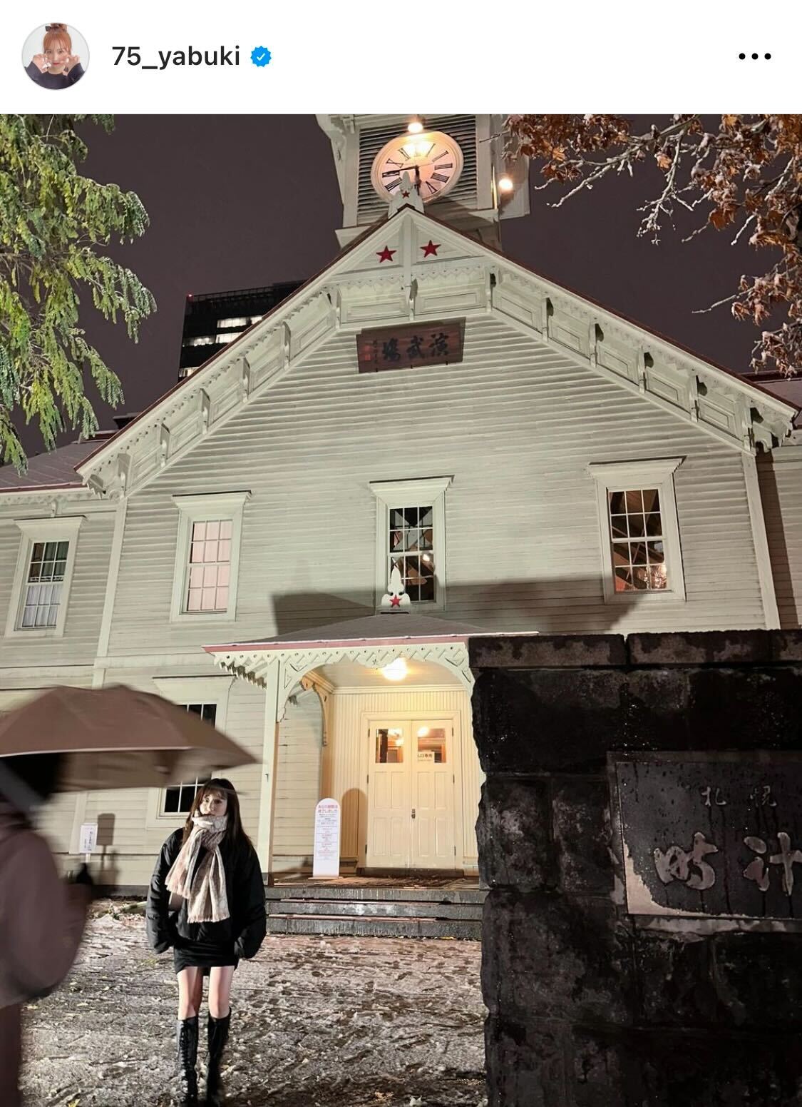 矢吹は「Hokkaido」とつづり、北海道でのオフショットを複数投稿。雪の中を歩く様子や雪景色を披露した。札幌市時計台の前での写真では、黒のダウンとミニ丈のスカートを合わせたコーディネートから美しい脚をのぞかせた。