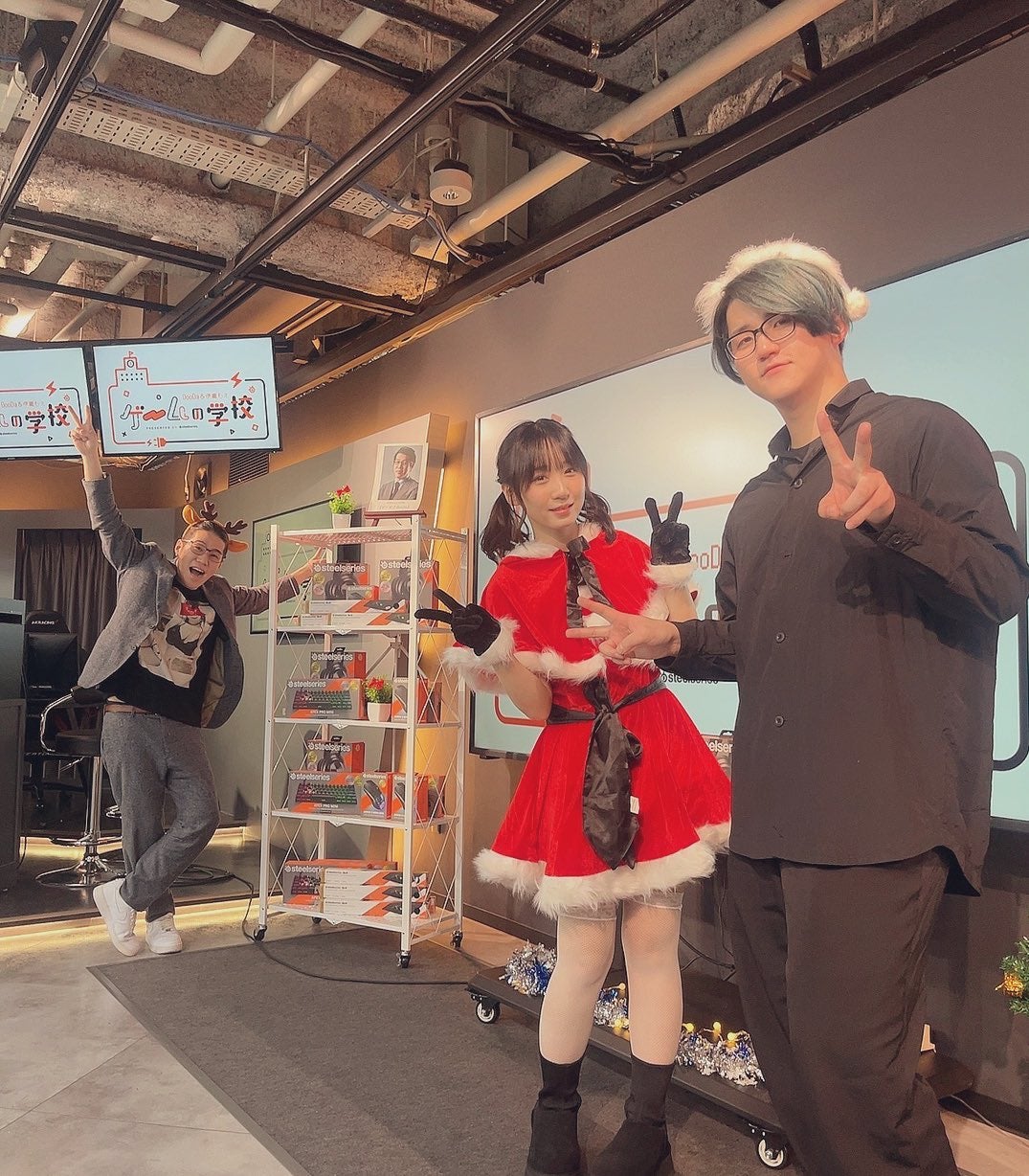 ゲーム大会や番組のMC・実況アナウンサーを務めるOooDaも同様にアップし、伊織はミニスカートのサンタコスプレからほっそりとした脚を大胆に披露している。