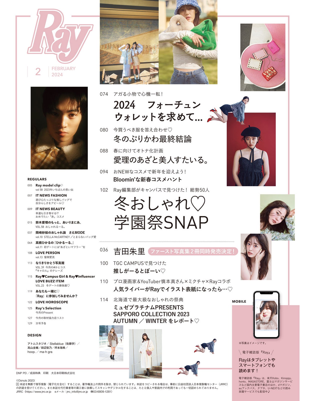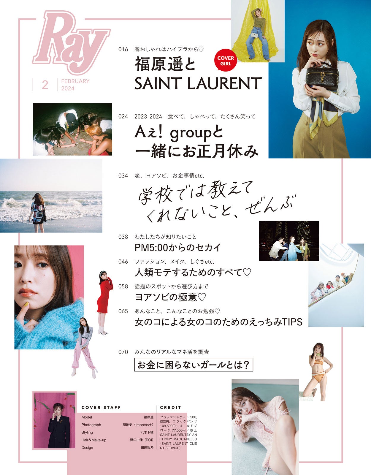 また、特別版の表紙は『Ray』に初登場するAぇ! groupが飾る。グループとして躍進するだけでなく、個人の活躍も目覚ましいメンバーが駆け抜けた1年を労うようなゆるくて楽しいお正月休みをイメージした撮影となっている。今号の特集は「恋、ヨアソビ、お金事情etc. 学校では教えてくれないこと、ぜんぶ。」“学校では教えてくれない、だけど、みんながリアルに知りたいこと”がたくさん詰め込まれている。恋のこと、ヨアソビのこと、お金の稼ぎ方など、青春を今の何倍も謳歌するための情報が紹介される。