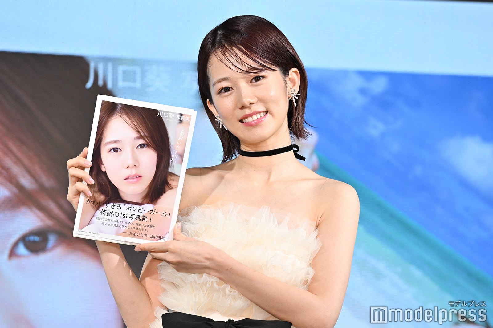 チュールが重ねられたチューブトップのミニワンピース姿で登場し、ほっそりとした脚を披露した川口。念願の写真集の出版が決まった際の心境を尋ねられると「ふらっと薬局に買い物に行く感じの普段の休日を過ごしていたんですけど、そのときにマネージャーさんから『ありがたいことに写真集が決まったよ』って連絡をいただいて、思わず立ち止まったことを覚えています」と回顧し、「すぐにお父さんやお母さんに報告しました」とにっこり。父親は30冊予約し、先日それが家に届いたそうで「写真が送られてきたんですけど、お家の中が本屋さんみたいになっていました(笑)」と笑顔を見せた。また、撮影時のエピソードを聞かれると「空港に着いたときは台風の影響で雨が降っていたんですけど、撮影が始まる頃には嘘みたいに晴れて、海もとってもきれいで肉眼で海水の中の地面まで見えたことを覚えていて、こんなに海がきれいなところで自分の写真集を撮影していただけるなんて本当に幸せだなって心から思ったことを覚えています」と目を輝かせ、船での撮影時に船酔いをしてしまったそうで「台風の影響で海が荒れていて、船が止まって撮影するときに“ヤバいかも…”って思って、船酔いってこれかって思って、船の2階でも撮影をしたんですけど、そのときが1番船酔いしましたね(笑)。でもやり切るしかないと思って、気のせいだと思って撮影していただきました」と裏話を披露した。