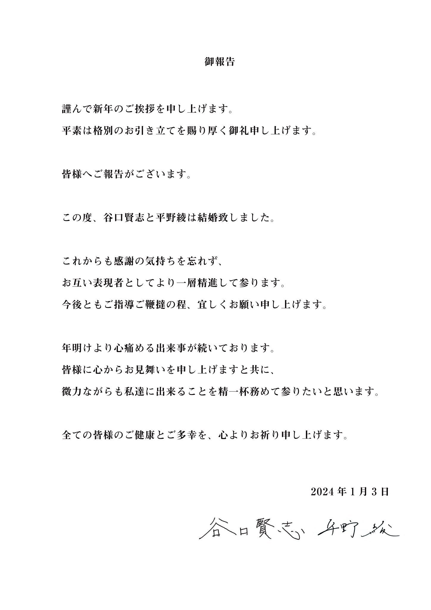 投稿にて、2人は「この度、谷口賢志と平野綾は結婚致しました」と連名での書面で報告。「これからも感謝の気持ちを忘れず、お互い表現者としてより一層精進して参ります」とつづった。また「年明けより心痛める出来事が続いております。皆様に心からお見舞いを申し上げますとともに、微力ながらも私たちにできることを精一杯務めて参りたいと思います」と令和6年能登半島地震の被災者などに向けたと思われるコメントを発表している。