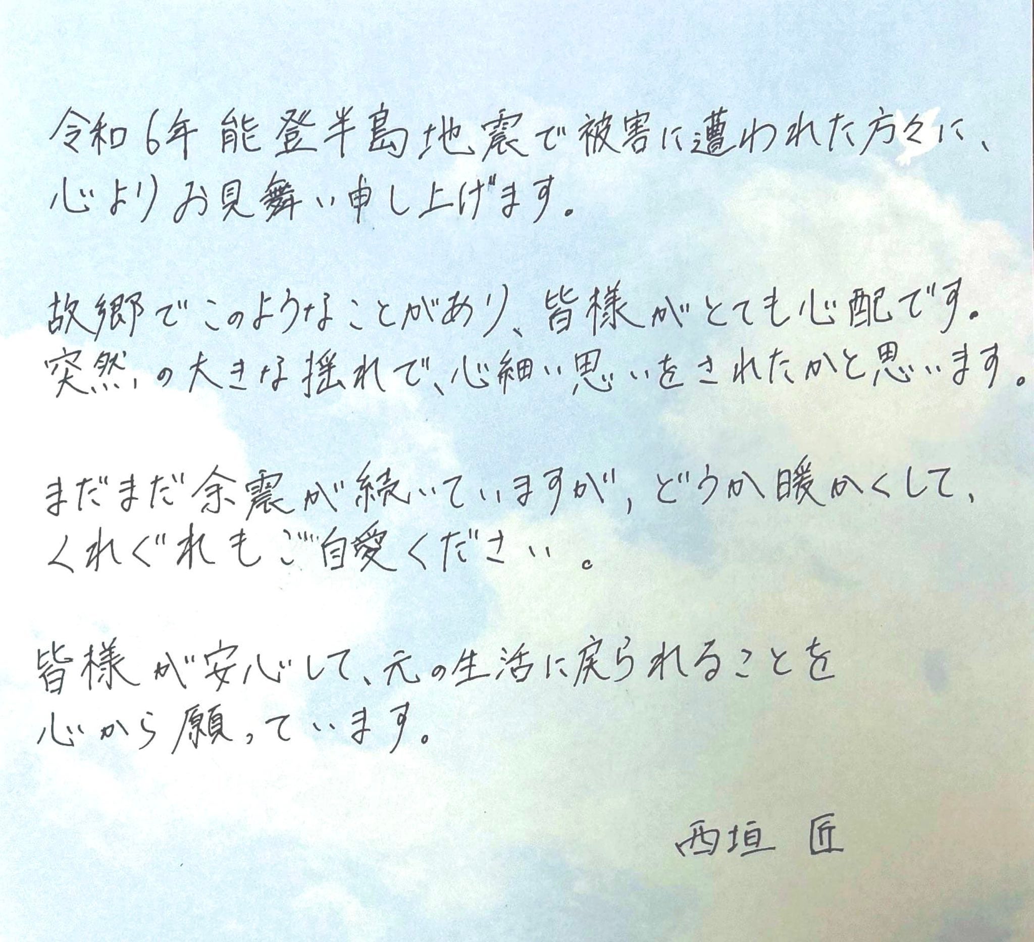 西垣は、直筆の手紙を公開し「令和6年能登半島地震で被害に遭われた方々に心よりお見舞い申し上げます。故郷でこのようなことがあり、皆様がとても心配です。突然の大きな揺れで心細い思いをされたかと思います」と故郷の石川で地震が発生したことを綴り、コメント。「まだまだ余震が続いていますが、どうか暖かくして、くれぐれもご自愛ください。皆様が安心して元の生活に戻られることを心から願っています」とメッセージを届けた。本年もよろしくお願いいたします。
