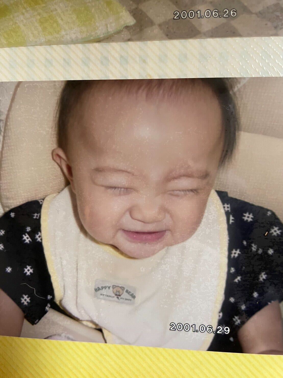 鶴房は、新年の挨拶をとともに実家に帰省したことを報告。「実家に帰りましたらいっぱい子供の頃の写真がありまして。まあ要するに昔から可愛いという自慢ですわ」と1歳から2歳にかけての幼少期の写真を4枚並べた。[#鶴房汐恩]