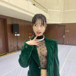 成人式に参加した藤川は「成人式は振り袖じゃなくてもいいんだよ」と自身のコーディネートを披露。緑のジャケットに縦のストライプが入ったパンツを合わせている。ジャケットの下に合わせているインナーはシースルーで、前開きのジャケットから美しいバストや肌を大胆に見せた。