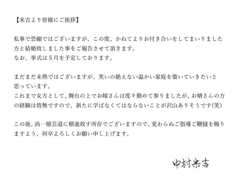 米吉は「私事で恐縮ではございますが、この度、かねてよりお付き合いをしてまいりました方と結婚致しました事をご報告させて頂きます」と結婚を発表。所属事務所によると、お相手は「長らくお付き合いをして参りました一般の方」だといい、挙式は2024年5月を予定しているという。続けて「まだまだ未熟ではございますが、笑いの絶えない温かい家庭を築いていきたいと思っています。これまで女方として、舞台の上でお嫁さんは度々勤めて参りましたが、お婿さんの方の経験は皆無ですので、新たに学ばなくてはならないことが沢山ありそうです(笑)」とユーモアたっぷりにコメントした。