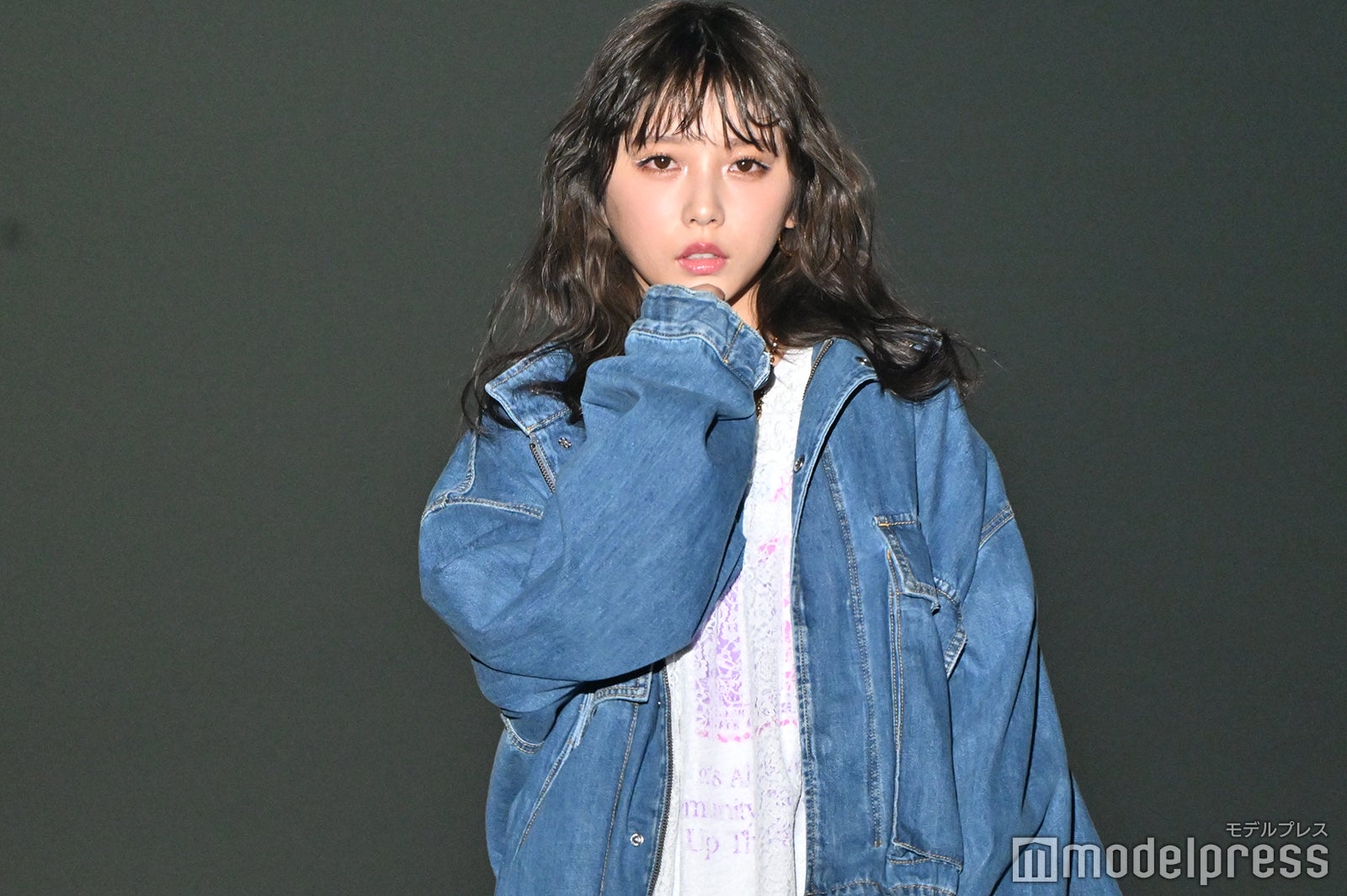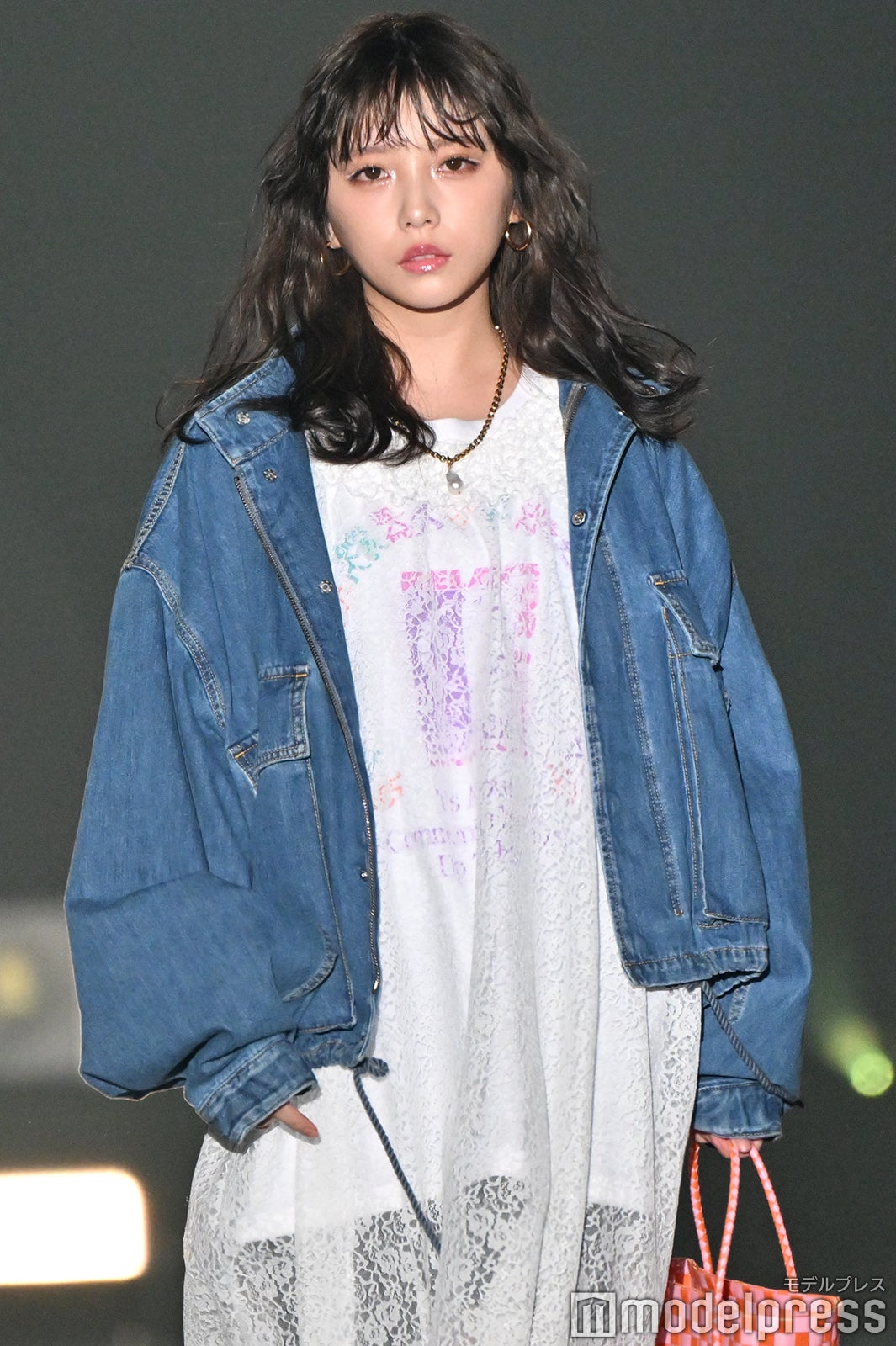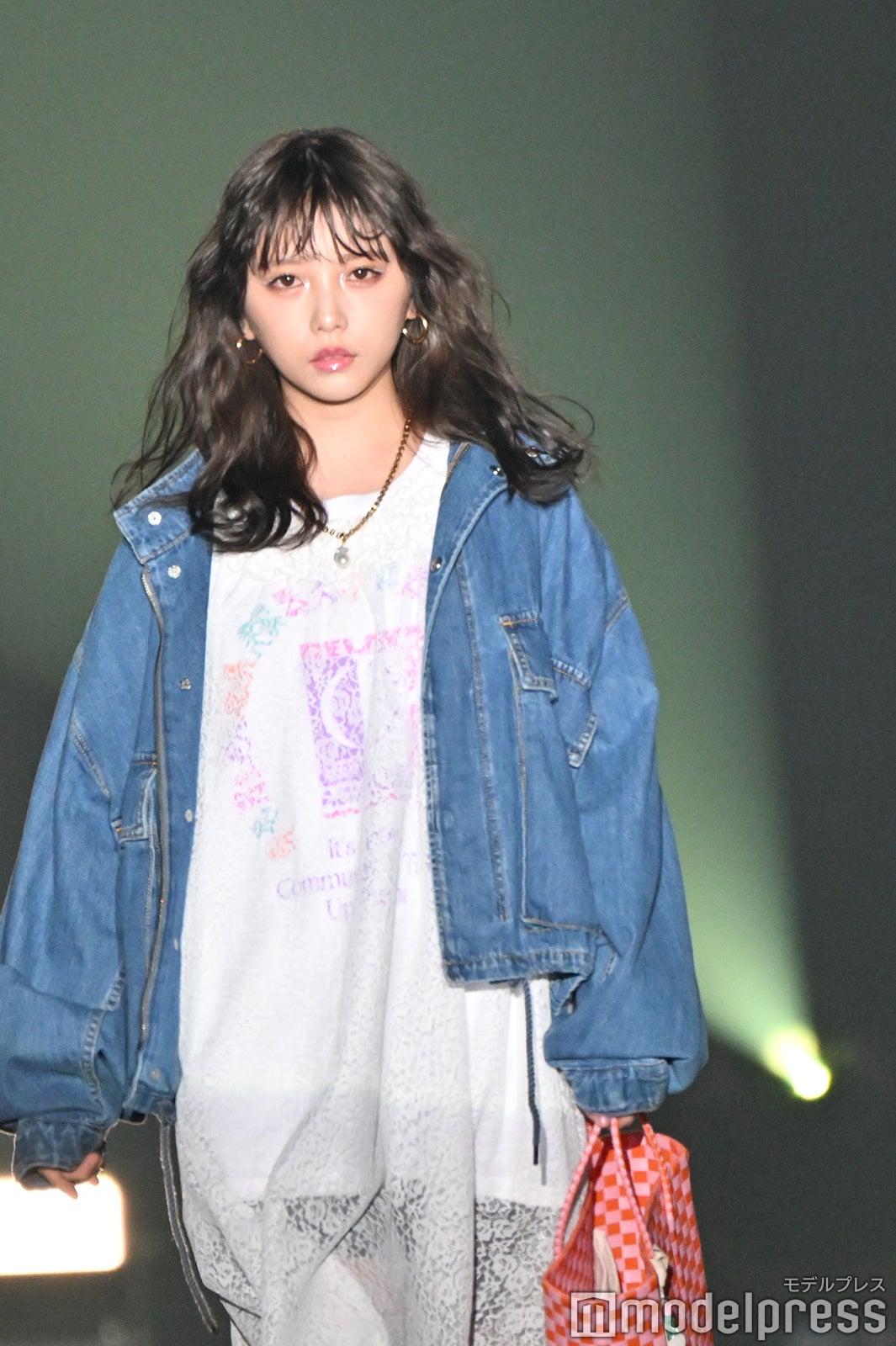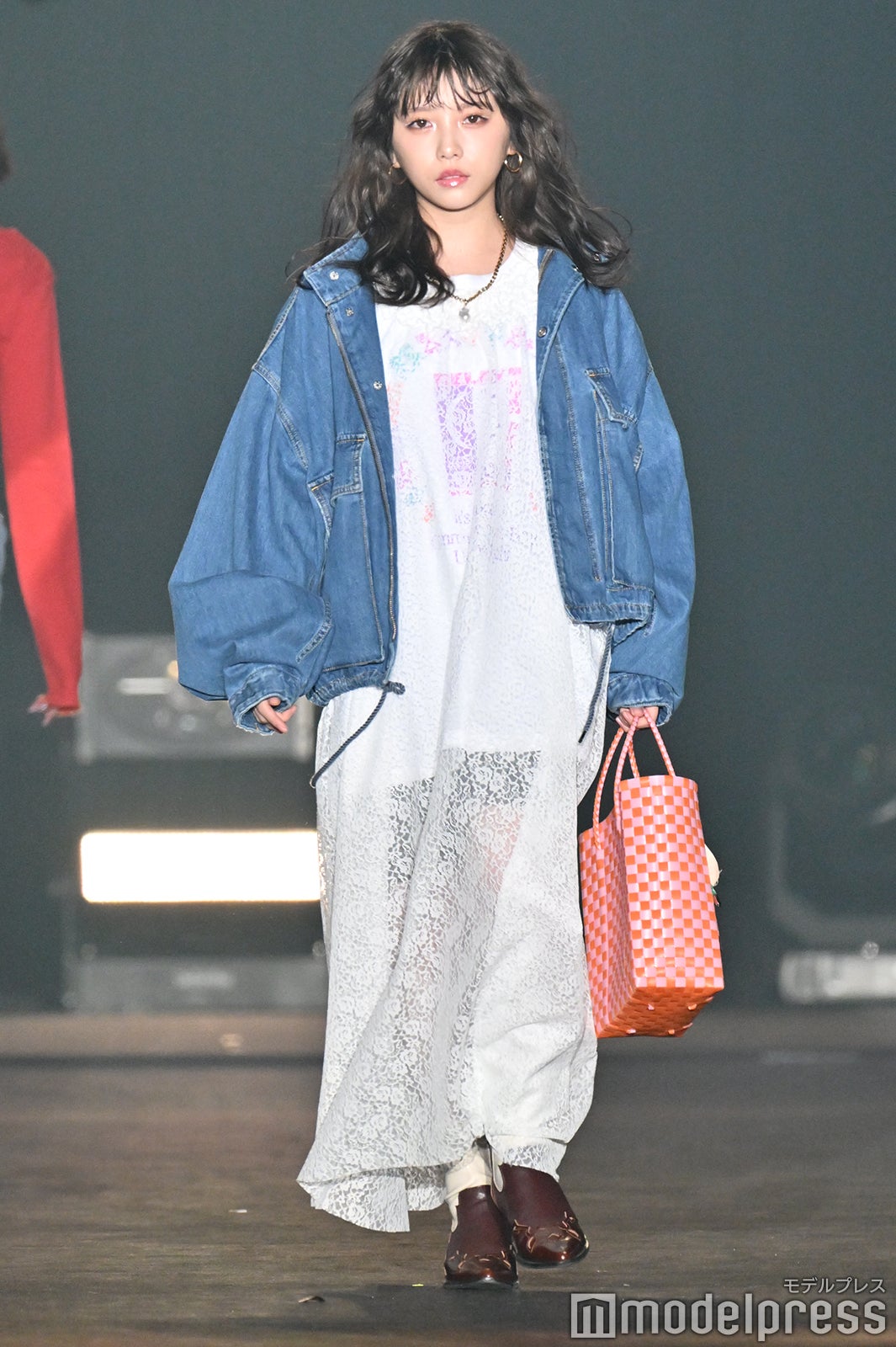 マスキュリンアイテムにスポーツ素材をミックスしたスタイリングで登場した与田。普段のストレートヘアとは印象が異なるカーリーなヘアスタイルでロマンティックな空気を演出した。ランウェイトップでは潤んだ瞳、ぷっくりとしたリップがきらめくキュートな表情を披露。会場中のファンの視線を独占した。