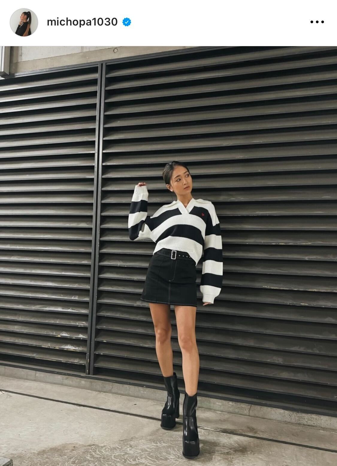 みちょぱは「久々に高めヒール履いて脚爆盛れ」とハイヒールのショートブーツにモノクロのボーダー柄トップスを合わせたスタイルを披露。ミニ丈のスカートからは美しい脚をのぞかせた。また「最近のあたしはお風呂上がりにクリームとオイル混ぜてゴリゴリ全身マッサージハマってます もちろん脚は裏表足裏足先まで満遍なく!」とスタイル維持の秘訣も明かしている。