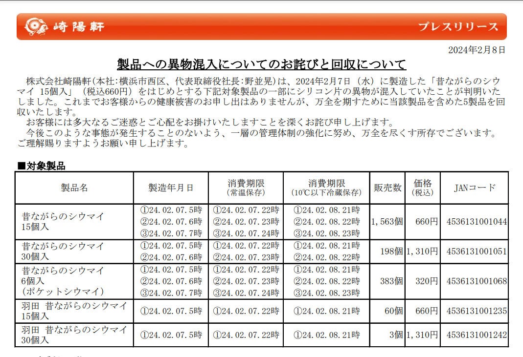 公式サイトでは「2024年2月7日(水)に製造した『昔ながらのシウマイ 15個入』(税込660円)をはじめとする下記対象製品の一部にシリコン片の異物が混入していたことが判明いたしました」と説明し、同様に「昔ながらのシウマイ 30個入」「昔ながらのシウマイ 6個入(ポケットシウマイ)」「羽田 昔ながらのシウマイ 15個入」「羽田 昔ながらのシウマイ 30個入」にも異物が混入していたと伝えた。これについて「これまでお客様からの健康被害のお申し出はありませんが、万全を期すために当該製品を含めた5製品を回収いたします」とし、「お客様には多大なるご迷惑とご心配をお掛けいたしますことを深くお詫び申し上げます」と謝罪。「今後このような事態が発生することのないよう、一層の管理体制の強化に努め、万全を尽くす所存でございます。ご理解賜りますようお願い申し上げます」としている。