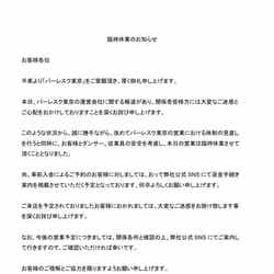 公式Xでは「本日臨時休業のお知らせです ご来店を予定されておりましたお客様には、大変ご迷惑おかけいたします 重ねてお詫び申し上げます」とし、書面にてコメントを掲載。「本日、バーレスク東京の運営会社に関する報道があり、関係者皆様方には大変なご迷惑とご心配をおかけしておりますことを深くお詫び申し上げます」と謝罪し、「このような状況から、誠に勝手ながら、改めてバーレスク東京の営業における体制の見直しを行うと同時に、お客様とダンサー、従業員の安全を考慮し、本日の営業は臨時休業させて頂くこととなりました」と伝えた。