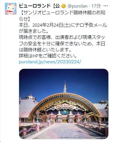 サンリオピューロランドが24日、テロ予告メールが届いたことにより臨時休館していることを公式サイトにて発表した。