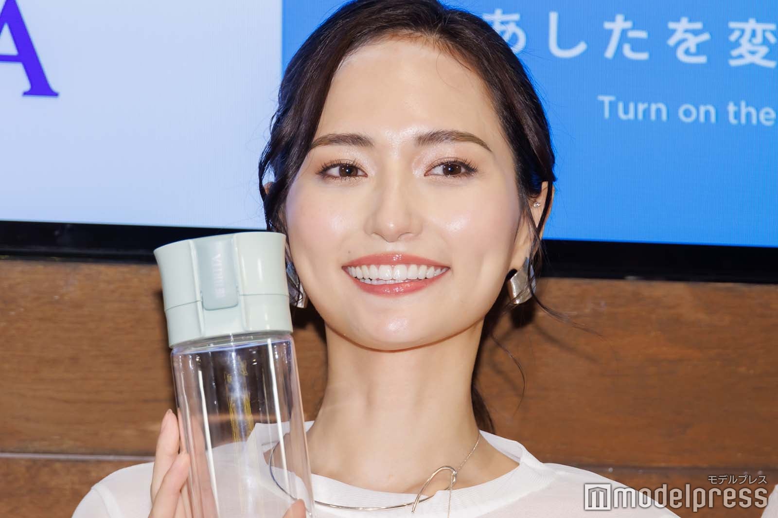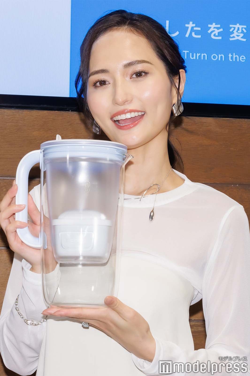 リブランディングに伴い展開される新プロジェクトのアンバサダーに就任した山賀は、上半身にシースルー素材を使用したオールホワイトの衣装で登場。アンバサダー就任の感想を聞かれると、「私は本当に『1番好きな飲み物は』と聞かれたら『お水』と答えるぐらい、本当にお水をよく飲むし大好き」と打ち明け、「お話をいただいた時はすごく嬉しかったです」と笑顔を見せた。また、日常で心掛けているサステナブル(持続可能)な行動を聞かれると、出先で水を買わずに持ち歩いていることを告白。さらに、「『これは長く使えるものかな』と考えて物を購入して、それを実際に何年間も長く愛用すること」とも伝えた。