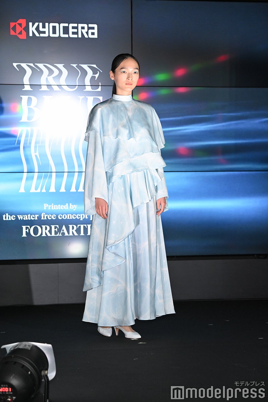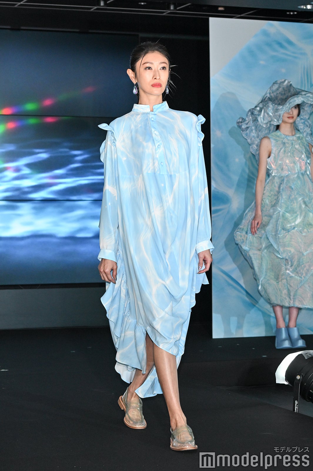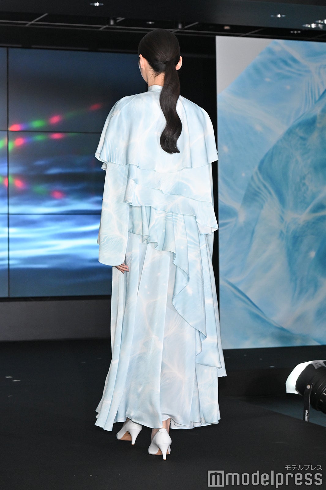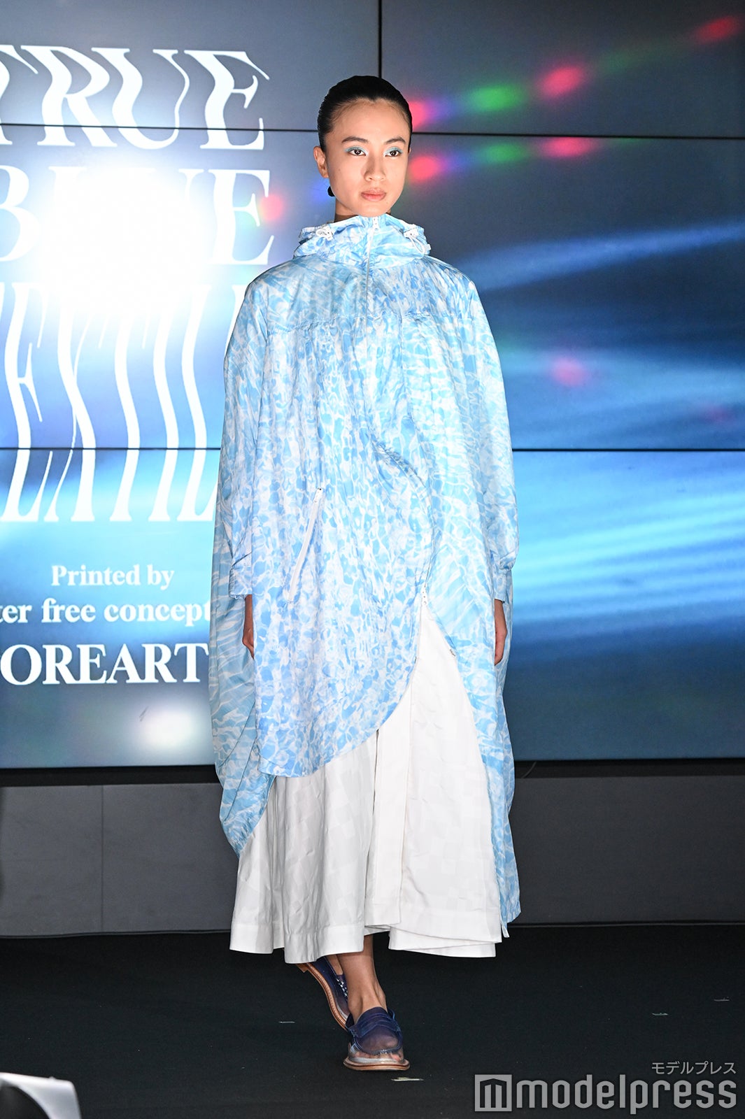 繊維・アパレル業界の水質汚染などの課題解決に貢献するため、水の使用量を極限まで削減したインクジェット捺染プリンターで、過去8回、水質ランキング日本一の成果を収めた高知県仁淀川の水面をプリントした衣装を身にまとい、ランウェイを闊歩し、美しい脚を披露した山田は、同衣装を着用した感想を求められると「発色がよくて色がきれいで、ホワイトがきれいだなと思ったし、揺れが波のようにすてき着ていて嬉しかったです」とにっこり。また、今回のプロジェクトにちなみ、普段、水や自然環境を守るために取り組んでいることを聞かれると「できることからちょっとずつって意識はしているんですけど、マイボトルを持ち歩いたり、ごみをきれいに分別するとか、小さいところから気は使っています」と明かし、着なくなった服はどうしているかという問いには「長く愛用できるものを買うようにしていたり、地元の沖縄にいとこや親戚がたくさんいるので、私が着なくなったものや、みんなが似合うだろうなと思ったものは沖縄に送っています」と打ち明けた。イベント後の代表質問に応じた山田は、同プロジェクトのテーマである“まもるためにまとう”にちなみ、最近、生活で守っているものや、心がけていることを尋ねられ「朝起きる時間は守っていますし、後回しにしがちなことも絶対に後回しにしないようにしています」とコメント。加えて、同プロジェクトには学生デザイナーも関わっているが、将来ファッション業界を目指している学生に応援メッセージを求められると「ファッションってたくさん可能性のあるすてきなお仕事なので、自分がやりたいこととか興味があることに突き進んでいただいて、ファッション業界の未来を明るく楽しくしていただきたいなと思います。そして私も置いていかれないように、ついていけるように頑張りたいと思います」と言葉に力を込めた。