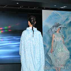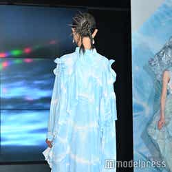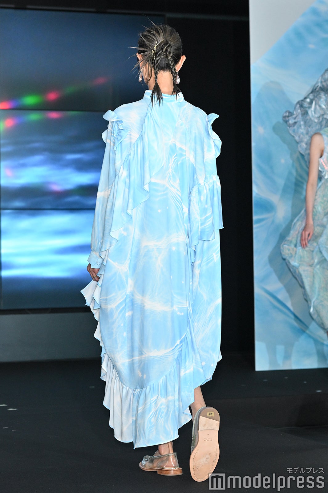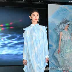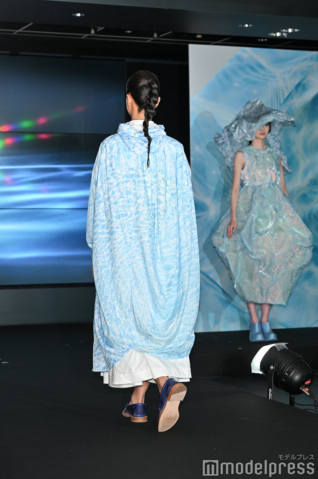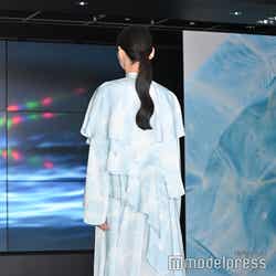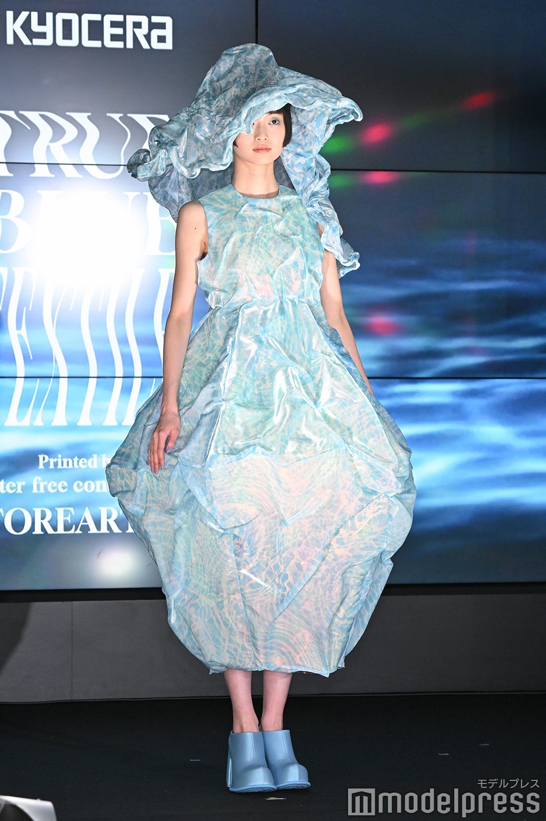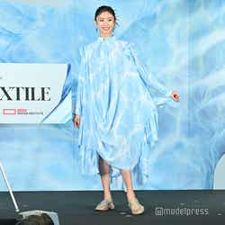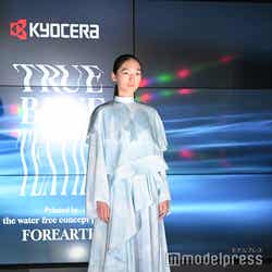 繊維・アパレル業界の水質汚染などの課題解決に貢献するため、水の使用量を極限まで削減したインクジェット捺染プリンターで、過去8回、水質ランキング日本一の成果を収めた高知県仁淀川の水面をプリントした衣装を身にまとい、ランウェイを闊歩し、美しい脚を披露した山田は、同衣装を着用した感想を求められると「発色がよくて色がきれいで、ホワイトがきれいだなと思ったし、揺れが波のようにすてき着ていて嬉しかったです」とにっこり。また、今回のプロジェクトにちなみ、普段、水や自然環境を守るために取り組んでいることを聞かれると「できることからちょっとずつって意識はしているんですけど、マイボトルを持ち歩いたり、ごみをきれいに分別するとか、小さいところから気は使っています」と明かし、着なくなった服はどうしているかという問いには「長く愛用できるものを買うようにしていたり、地元の沖縄にいとこや親戚がたくさんいるので、私が着なくなったものや、みんなが似合うだろうなと思ったものは沖縄に送っています」と打ち明けた。イベント後の代表質問に応じた山田は、同プロジェクトのテーマである“まもるためにまとう”にちなみ、最近、生活で守っているものや、心がけていることを尋ねられ「朝起きる時間は守っていますし、後回しにしがちなことも絶対に後回しにしないようにしています」とコメント。加えて、同プロジェクトには学生デザイナーも関わっているが、将来ファッション業界を目指している学生に応援メッセージを求められると「ファッションってたくさん可能性のあるすてきなお仕事なので、自分がやりたいこととか興味があることに突き進んでいただいて、ファッション業界の未来を明るく楽しくしていただきたいなと思います。そして私も置いていかれないように、ついていけるように頑張りたいと思います」と言葉に力を込めた。