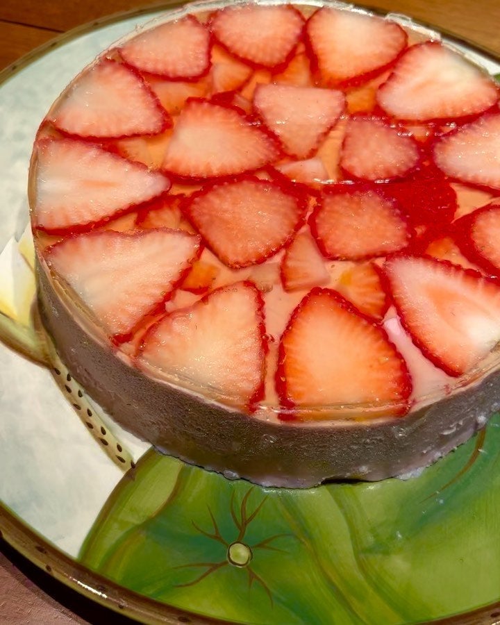 完成したスイーツの動画も公開しており、薄く切ったいちごが断面に並べられ華やかな見た目となっている。