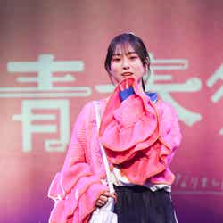 ボリュームのある袖が印象的なピンクの羽織りスタイルで登場した寺島。ブラックのミニスカートからは美しい脚を披露した。ランウェイ中は、ファンの声援にハートポーズで応えるなど、ファンサービスもたっぷりのステージとなった。