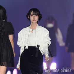鎮西はストライプのセットアップで登場。ジャケットの中には流行のリボンがついたトップスを着用し、美しいウエストをチラリとのぞかせた。また、ミニスカートからはスラリと伸びた美脚を披露。観客を魅了した。