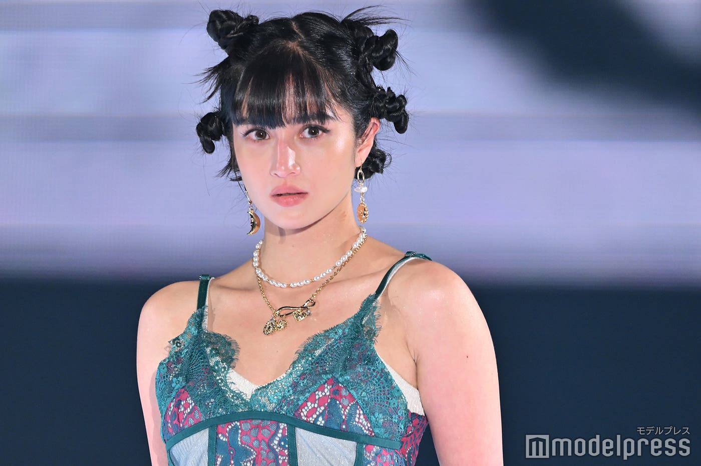 Takiは、レースの透け素材が印象的なターコイズブルーとピンクのキャミソールに美しいウエストがのぞくデニムを合わせたコーディネートを着こなし。以前は茶髪で前髪を流して額を見せる大人っぽい髪型だったTakiは、黒髪に前髪を眉で切りそろえたぱっつんヘアにイメージチェンジした姿をお披露目した。「ガルアワ」テーマは「TOKIMEKI GALAXY TRIP」