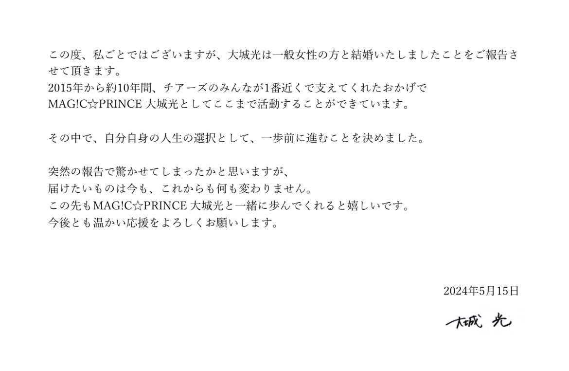 所属事務所は「この度、弊社所属 大城光(MAG!C☆PRINCE)が、結婚いたしましたことをご報告させて頂きます」と発表。大城は直筆のサインを添え「一般女性の方と結婚いたしましたことをご報告させて頂きます」とお相手にも言及した。また、MAG!C☆PRINCEのファン・チアーズに向け「2015年から約10年間、チアーズのみんなが1番近くで支えてくれたおかげでMAG!C☆PRINCE 大城光としてここまで活動することができています」と感謝。「その中で、自分自身の人生の選択として、⼀歩前に進むことを決めました」と結婚を決断した理由を明かした。