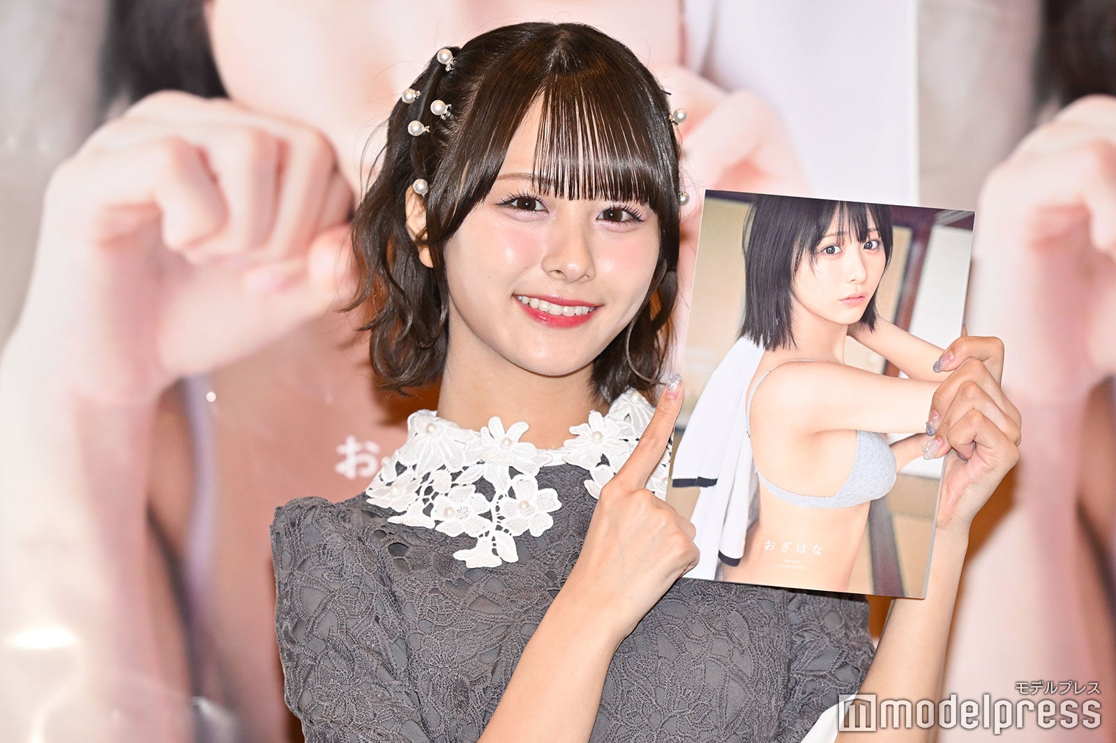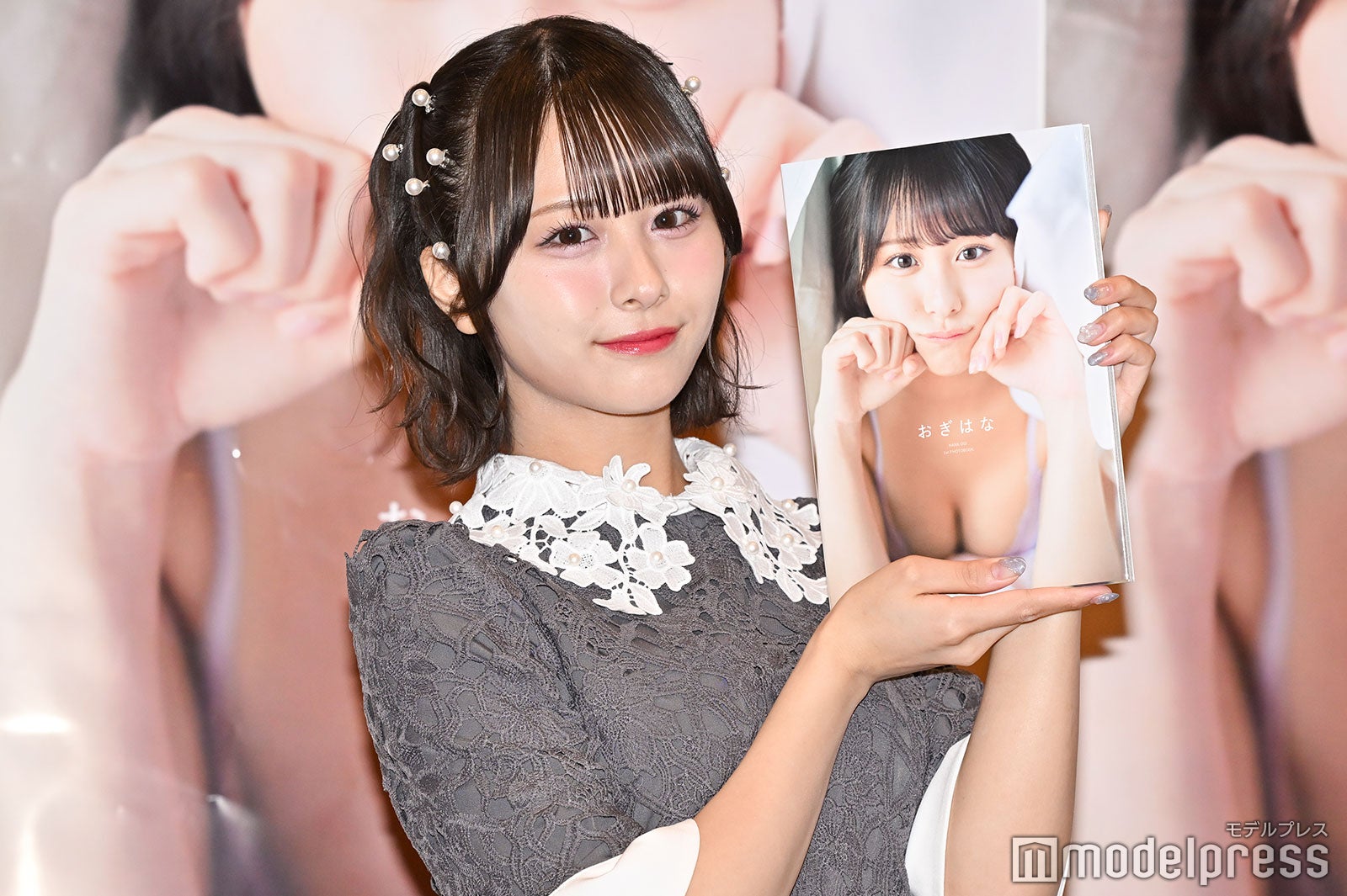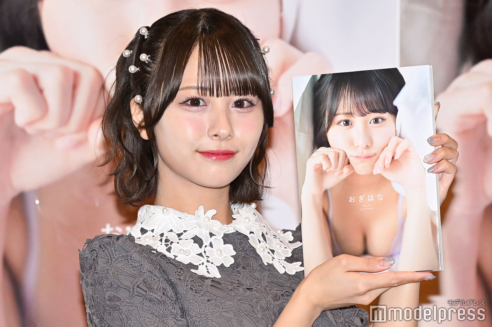 お気に入りには、カバーを外した表1のランジェリーカットを挙げ「このランジェリーが私的にお気に入りの色でもあるんですけど、自分らしいカットだなと思って、元気な感じと、今回の写真集では素の自分をお届けできたらいいなと思って撮影に臨んだので、それがすごく出ているカットの1つなんじゃないかあと思いました」とアピール。タイトルの『おぎはな』はスタッフが決めたそうで「お母さんが撮影前にタイトルは絶対に『おぎはながいい』って言っていたんですけど(笑)、そうしたら『おぎはな』になって私はびっくりしました」と偶然の一致に目を丸くし、「お母さんの希望は『#おぎはな』だったんですけど(笑)、お母さんってさすがだな、わかってるなって思いました」と感嘆した。さらに、体作りなど撮影前に準備したことはあるか尋ねられた尾木は「普段から習慣づけることが好きで、毎日、足のマッサージとかはアイドルになってから欠かさずやっているんですけど、今回はアイドルをやっているときと見える部分が違う撮影でもあったので、足だけじゃなくて全身のマッサージだったり、お母さんに協力してもらって食事制限をしてもらったりして気をつけていました」と打ち明け、その成果は同写真集で見られるかと問われると「お腹に(お肉が)つきやすいんですけど、ある程度は細くなっていたかなというのと、先ほどお見せしたお気に入りのカットでも二の腕が見えていたんですけど、もともと二の腕がぷにっとしていたのが悩みで(笑)、それが今回の写真集で自分的には満足できる写りだったのでよかったなって思いました」と笑顔を見せた。