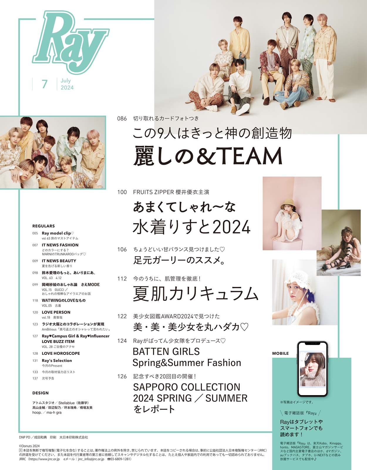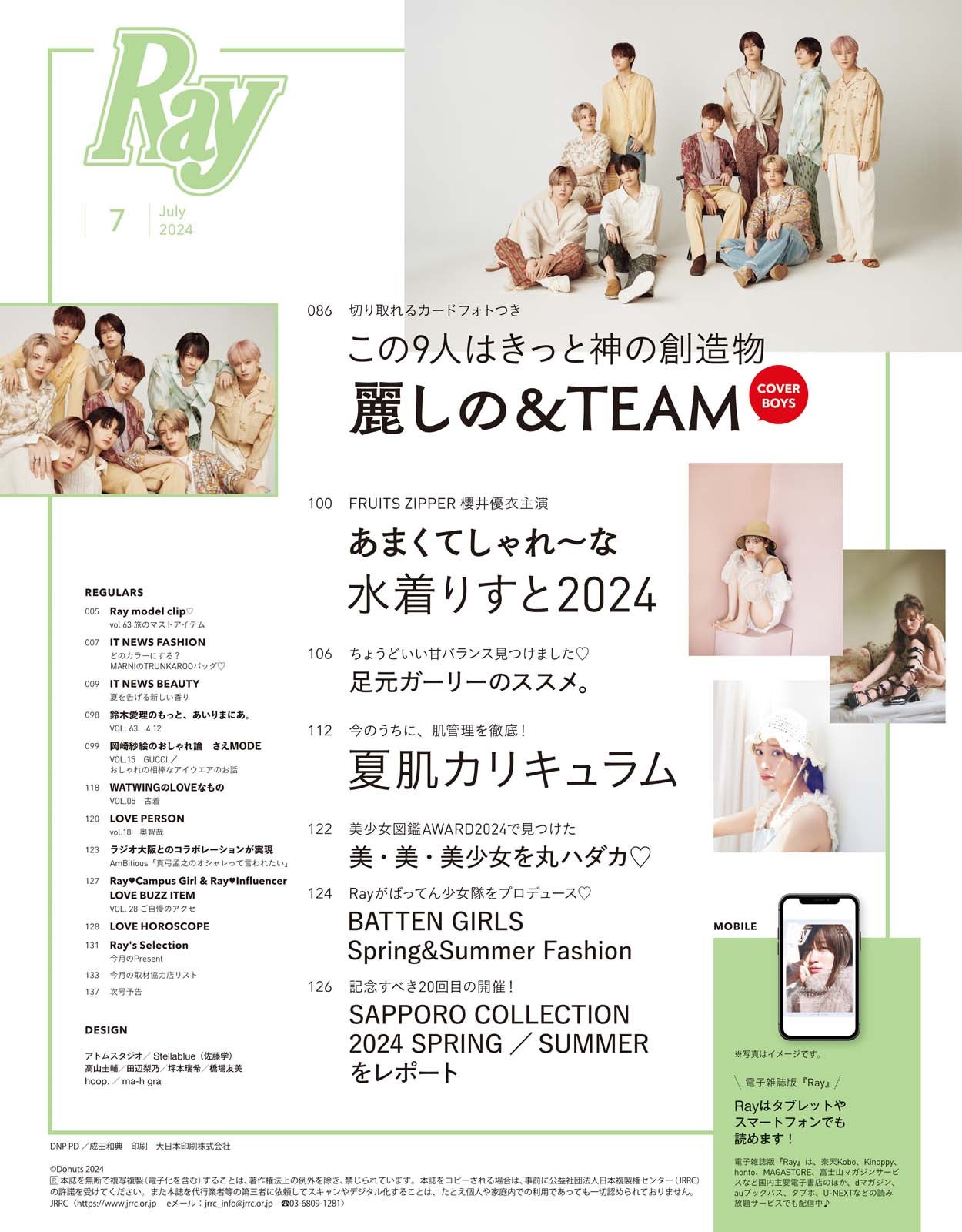 9月号での「Ray」専属モデル卒業を発表した鈴木は、白を基調としながらも黒の直線と赤い花模様が個性的な浴衣にカンカン帽を合わせたモダンな装いで表紙に登場。帽子から伸びる黒のレースリボンと白ラメのシアーな兵児帯で作った大ぶりのお花でガーリーさをプラスしている。「恋する浴衣」と題した中面企画でも、恋する女の子を熱演しながらこの夏トレンドの浴衣や着回しを紹介する。また、鈴木の卒業プロジェクトが始動。卒業に向けて行われた編集部との打ち合わせ中、実感が湧いてきて思わず涙が溢れたほどたくさんの思いがこもった「卒業までにやりたいことリスト」を明かす。なぜそれをやりたいのか…これまでの「Ray」撮影時のオフショットを交えながら鈴木が紡ぐ等身大のことばとともに届ける。