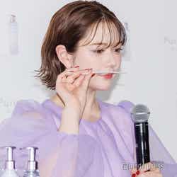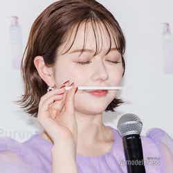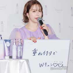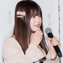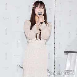 水上は美しいデコルテが際立つ淡色のロングワンピースで登場。ともにHKT48を卒業後も連絡を取り合う親友である村重と“香り”と“キュン”にまつわるトークを展開した。早速、どんなシチュエーションで商品の香りを感じたらキュンとするかという質問には水上が「腕を組んでいる時」と回答。「女の子同士で歩くときに手を繋いだり腕を組んだりして歩くことがすごく多いんですけど、そういうときに距離が近くなるじゃないですか?そうすると良い匂いがするとずっとくっつきたくなる」と続けた。