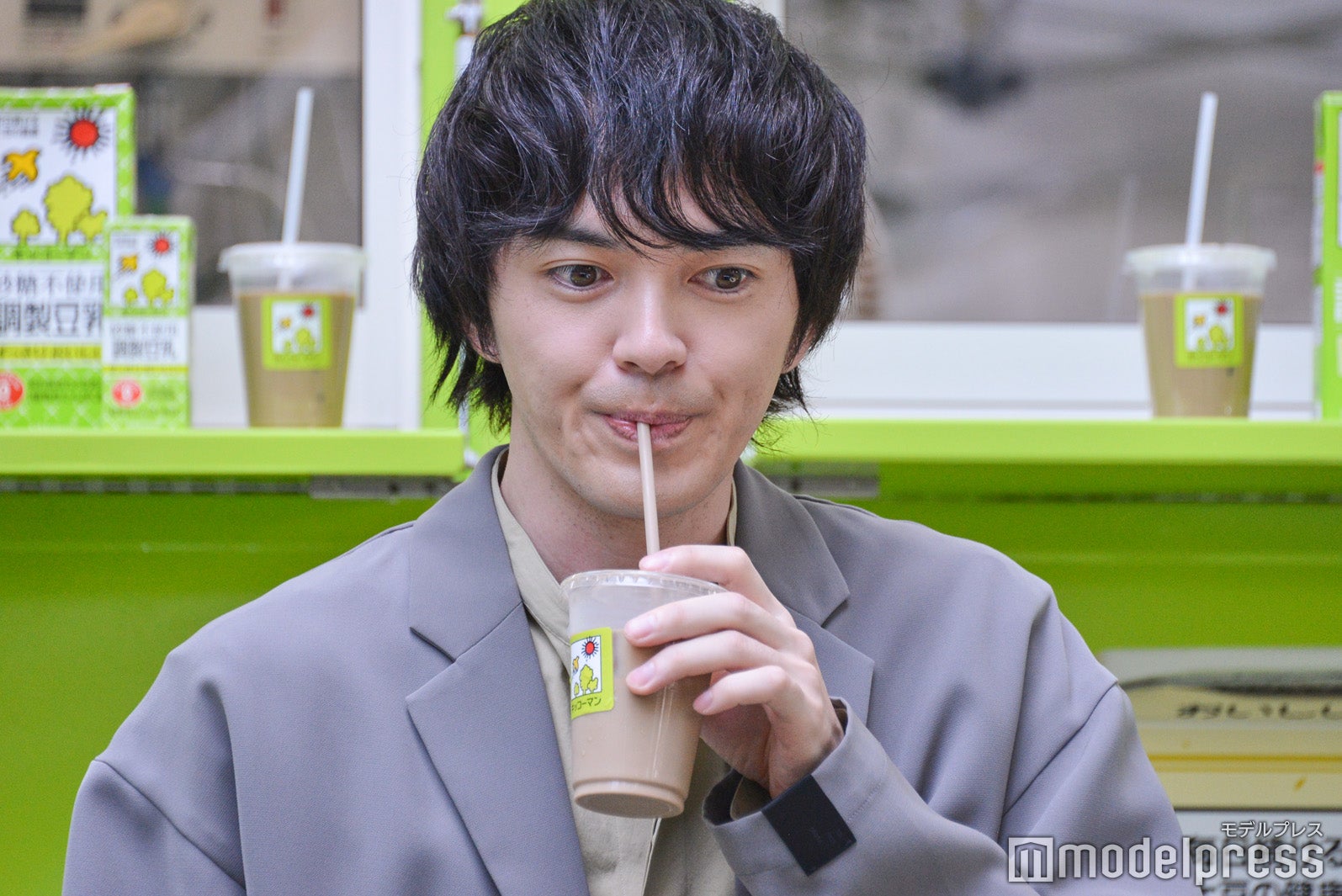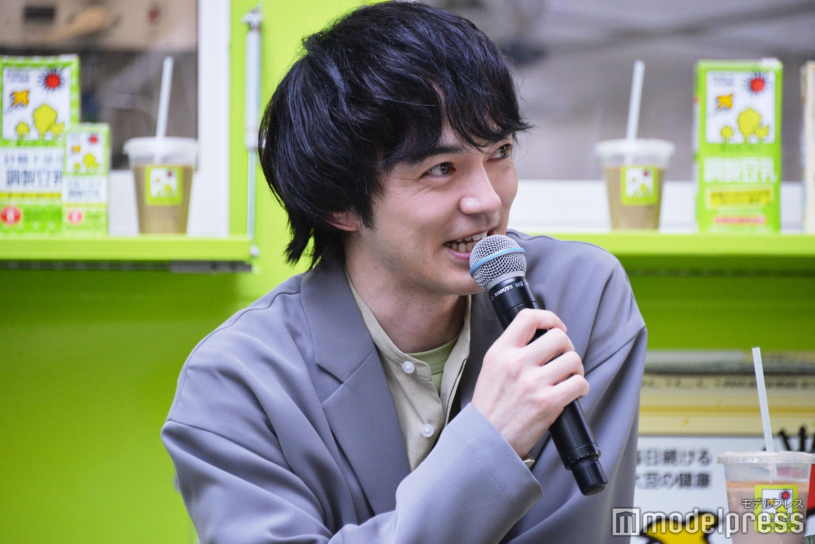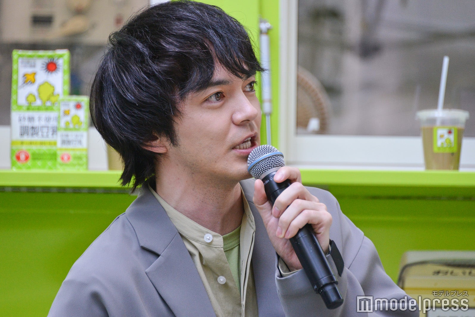 林遣都は、豆乳メーカーの1日広報大使として、緑を差し色にしたコーディネートで登場。1歳児のパパであり、子育てにおいて豆乳に助けられているとのことで「子どもが小さいんですけど、とにかく子どもの料理に役立つ」とコメント。「子どもってご飯を食べなかったりするじゃないですか。それですごく悩んだんですけど、豆乳で作ったスープとかシチューは結構食べてくれるんですよ」と子育てに役立った料理エピソードを語った。