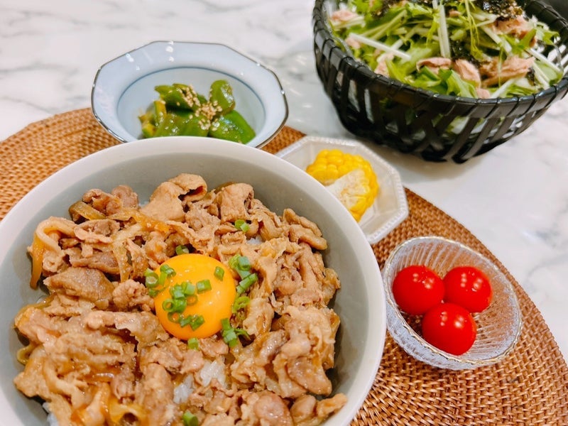 この日、渡辺は「豚肉1キロで豚丼の具を作りました」と報告。フライパンいっぱいに作った豚丼の具の写真を公開した。続くブログでは、ごはんの上にたっぷりと豚丼の具、黄身、ネギを添えた豚丼や、サラダ、プチトマト、トウモロコシ、副菜を並べた“夜ごはん”の写真も投稿。「夜ごはん 豚丼」とつづり、ブログを締めくくった。