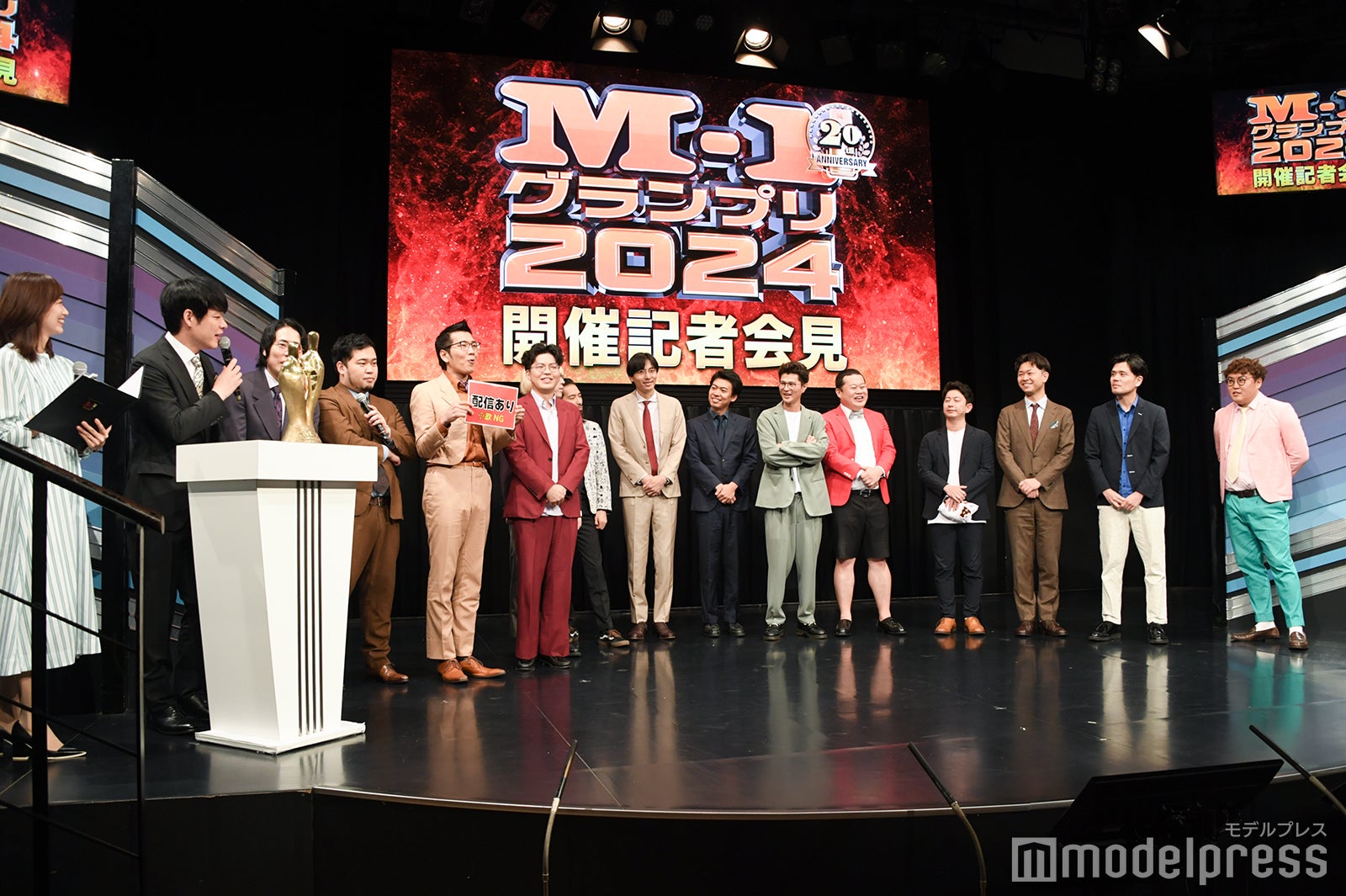 前列左から:川島明、マユリカ(阪本、中谷)、ヤーレンズ(楢原真樹、出井隼之介)、令和ロマン(高比良くるま、松井ケムリ)、真空ジェシカ(ガク、川北茂澄)、カベポスター(永見大吾、浜田順平)/後列左から:フースーヤ(田中ショータイム、谷口理)、トム・ブラウン(布川ひろき、みちお)、ダンビラムーチョ(大原優一、原田フニャオ)、モグライダー(芝大輔、ともしげ)、ロングコートダディ(堂前透、兎)、ダイタク(吉本大、吉本拓)、ナイチンゲールダンス(中野なかるてぃん、ヤス)(C)モデルプレス この日の会見は、麒麟・川島明とABCテレビの斎藤真美アナが司会を担当。昨年王者の令和ロマン、昨年ファイナリストのヤーレンズ、マユリカ、真空ジェシカ、カベポスター、モグライダー、ダンビラムーチョをはじめ、ロングコートダディ、トム・ブラウン、ダイタク、フースーヤ、ナイチンゲールダンスが出席した。(modelpress編集部)