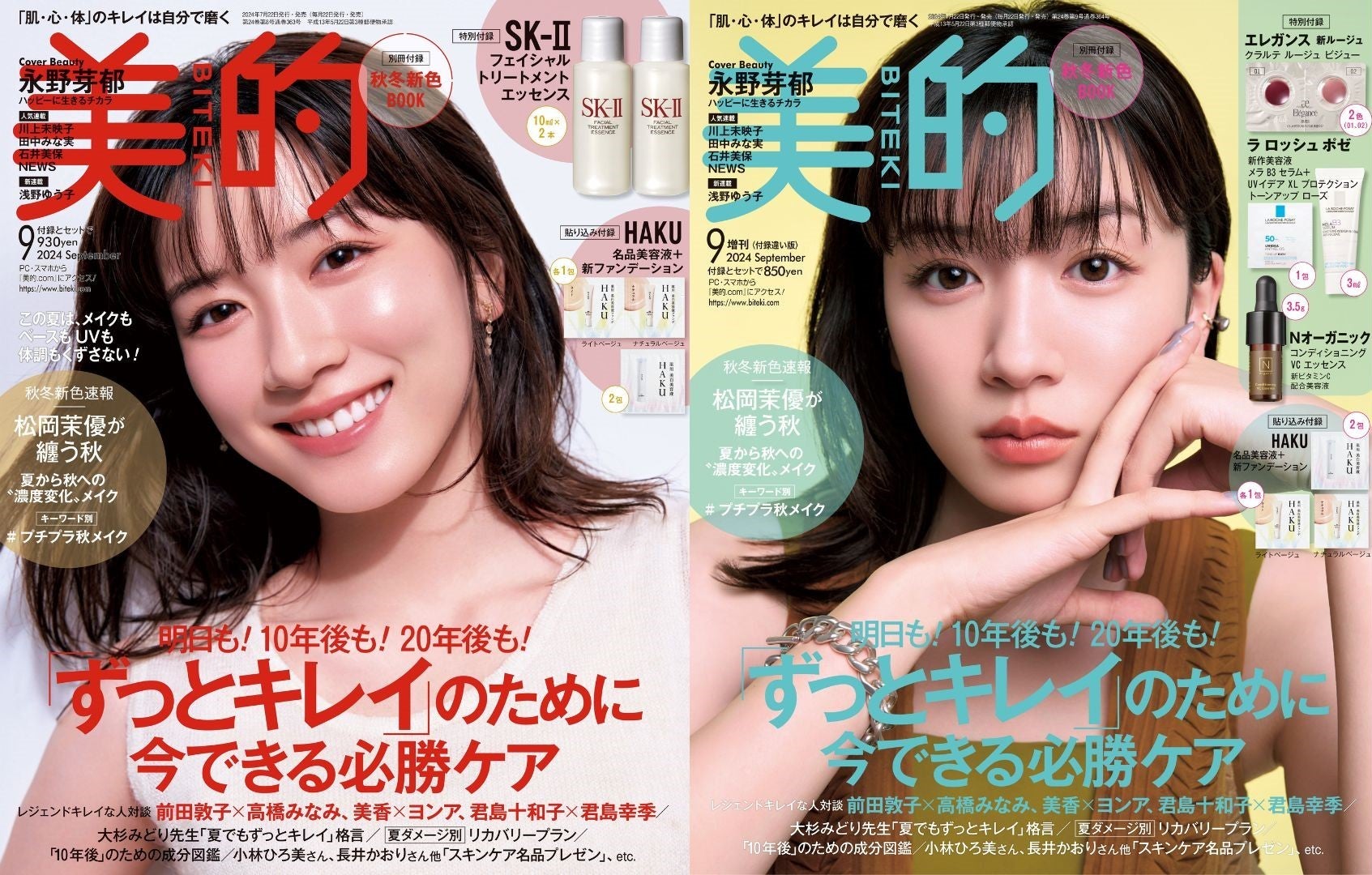 間近で見ても毛穴レスで透き通るような美肌に、大きな瞳の吸引力。そしておっとりした優しい雰囲気の喋り方と、多幸感あふれる笑顔で「かわいすぎる…!」と本誌スタッフを驚かした永野。今号の表紙で、爽やかな「白」の通常版と、秋先取りの「黄」がテーマの付録違い版2パターンを飾っている。表紙カットについて、永野は「どちらもすごく好きでした(ハート)白い洋服に合わせたほんのり血色のあるワントーンメイクは、柔らかいイメージで自分でも真似してみたいなと思いましたし、秋色の服に合わせたリップ主役のメイクはプライベートでのセルフメイクにも近い感じです」とキラキラした瞳で語った。