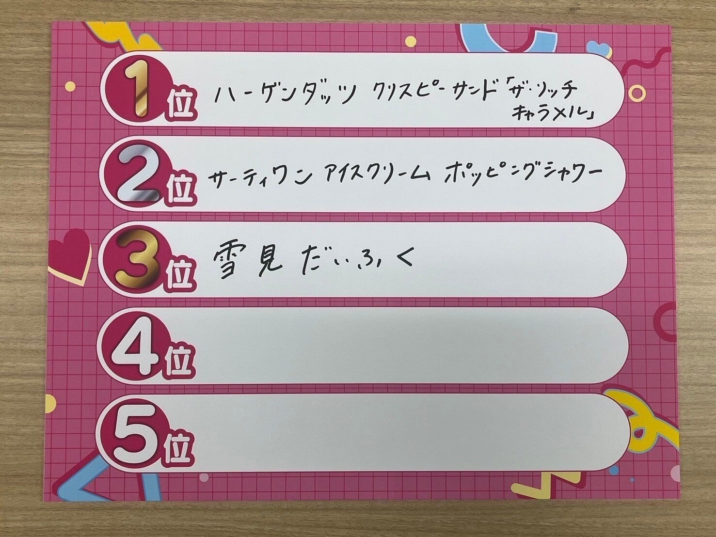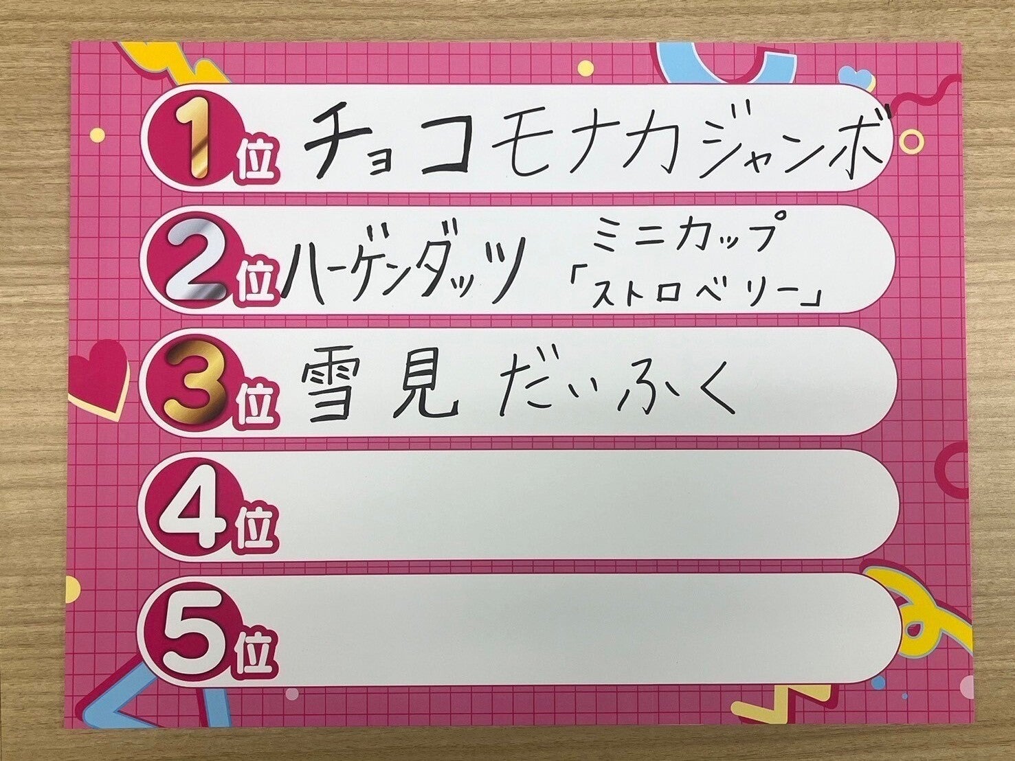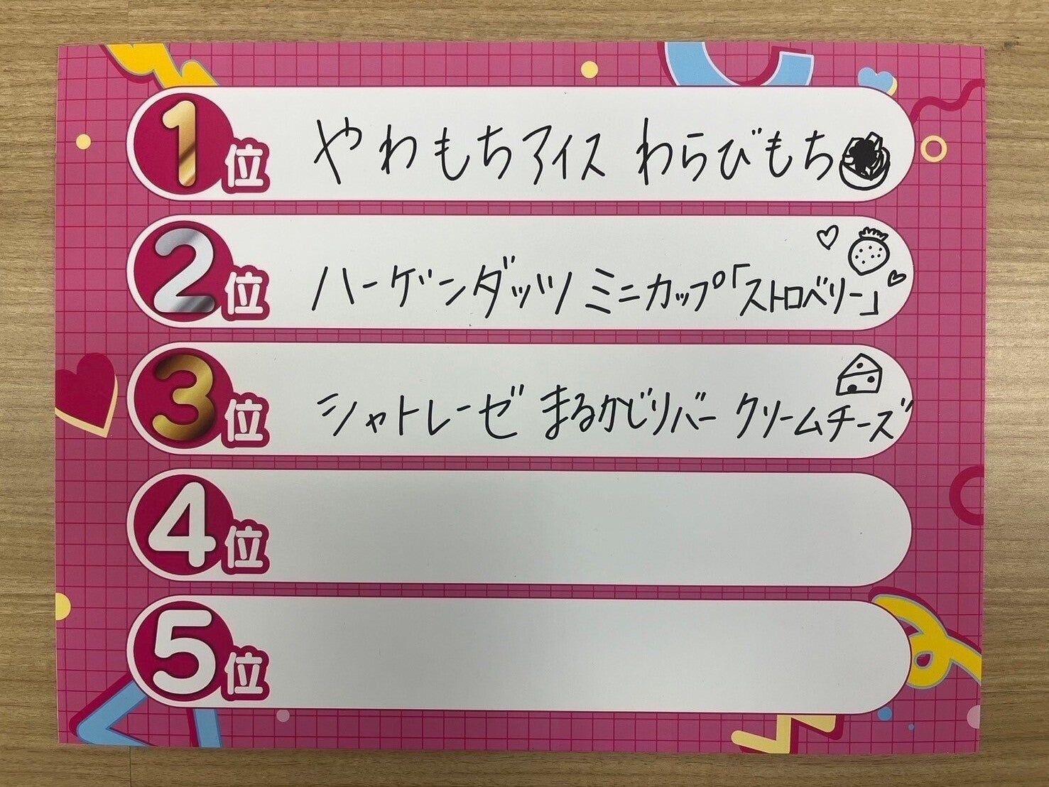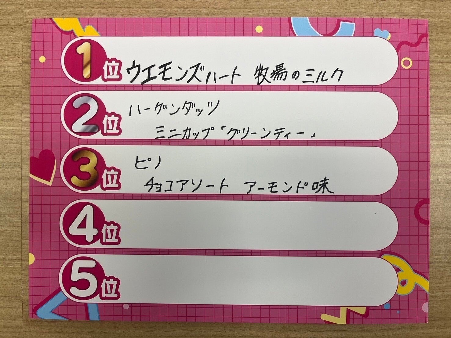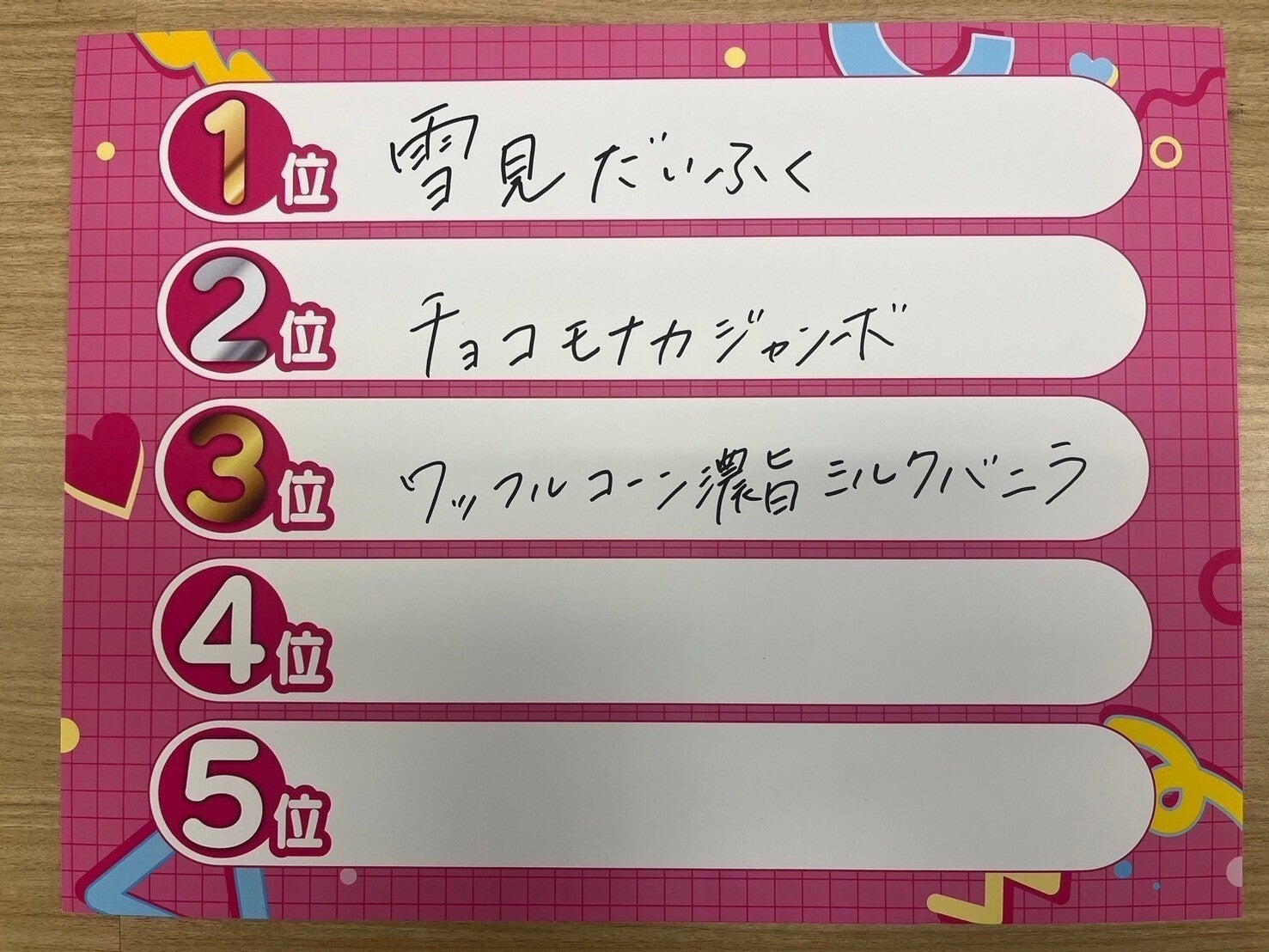 トップ5は、フジコーズのメンバー16人がそれぞれトップ3を発表し、1位が5点、2位が4点、3位が3点の総合点で決まった。番組ではトップ5に入らなかったが、メンバーの上西萌々が1位に挙げた「やわもちアイス わらびもち」を試食していた。