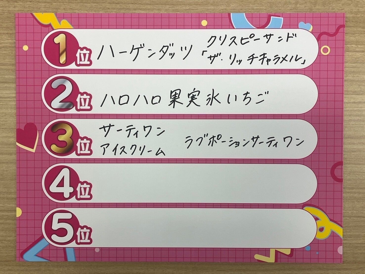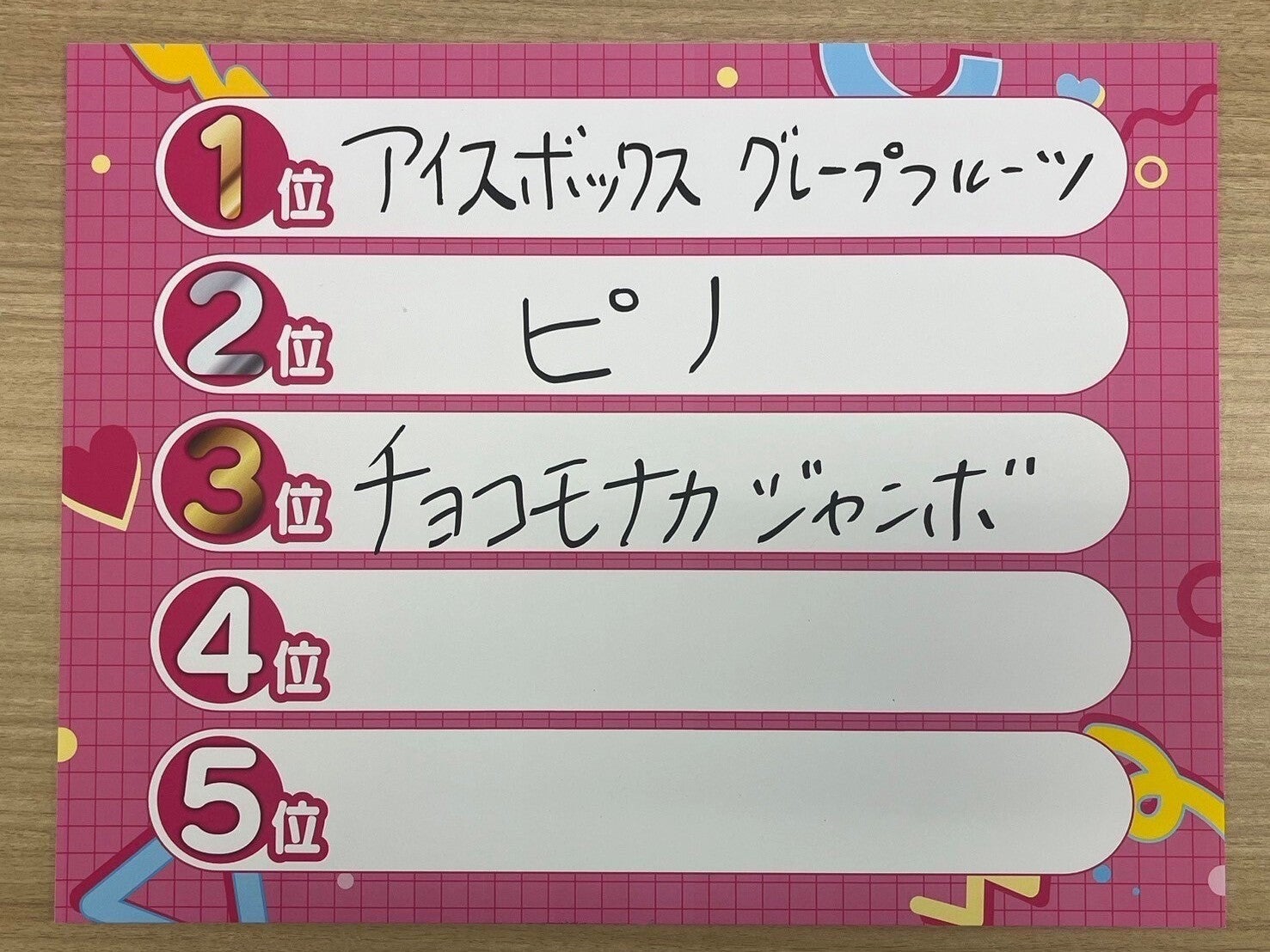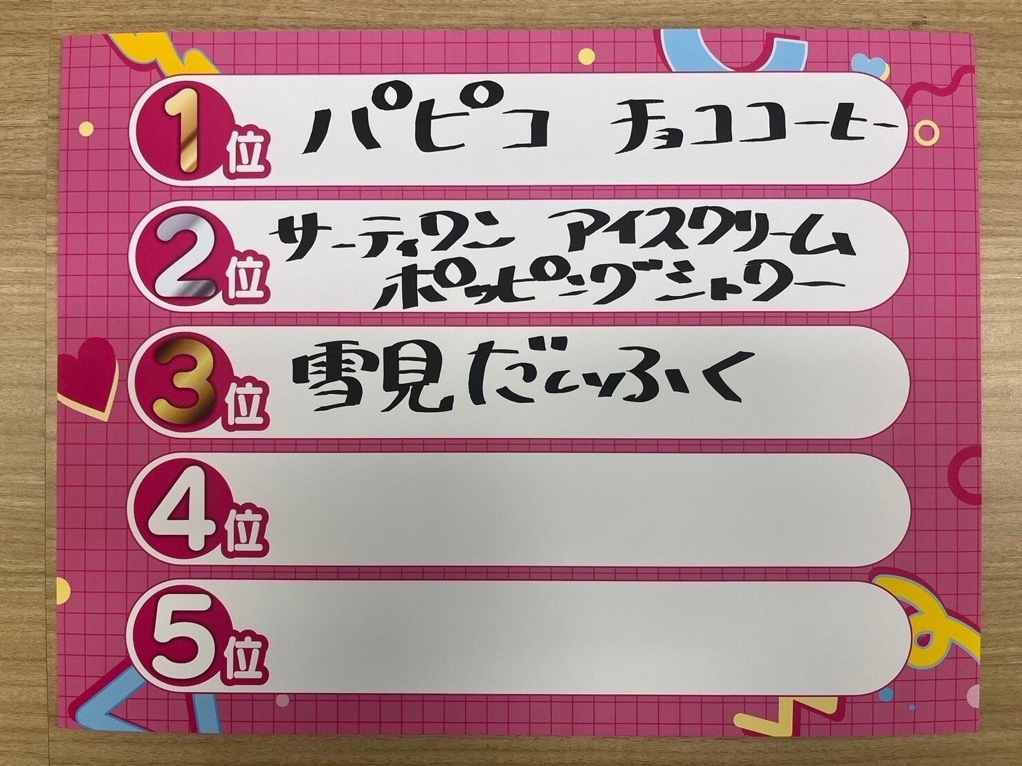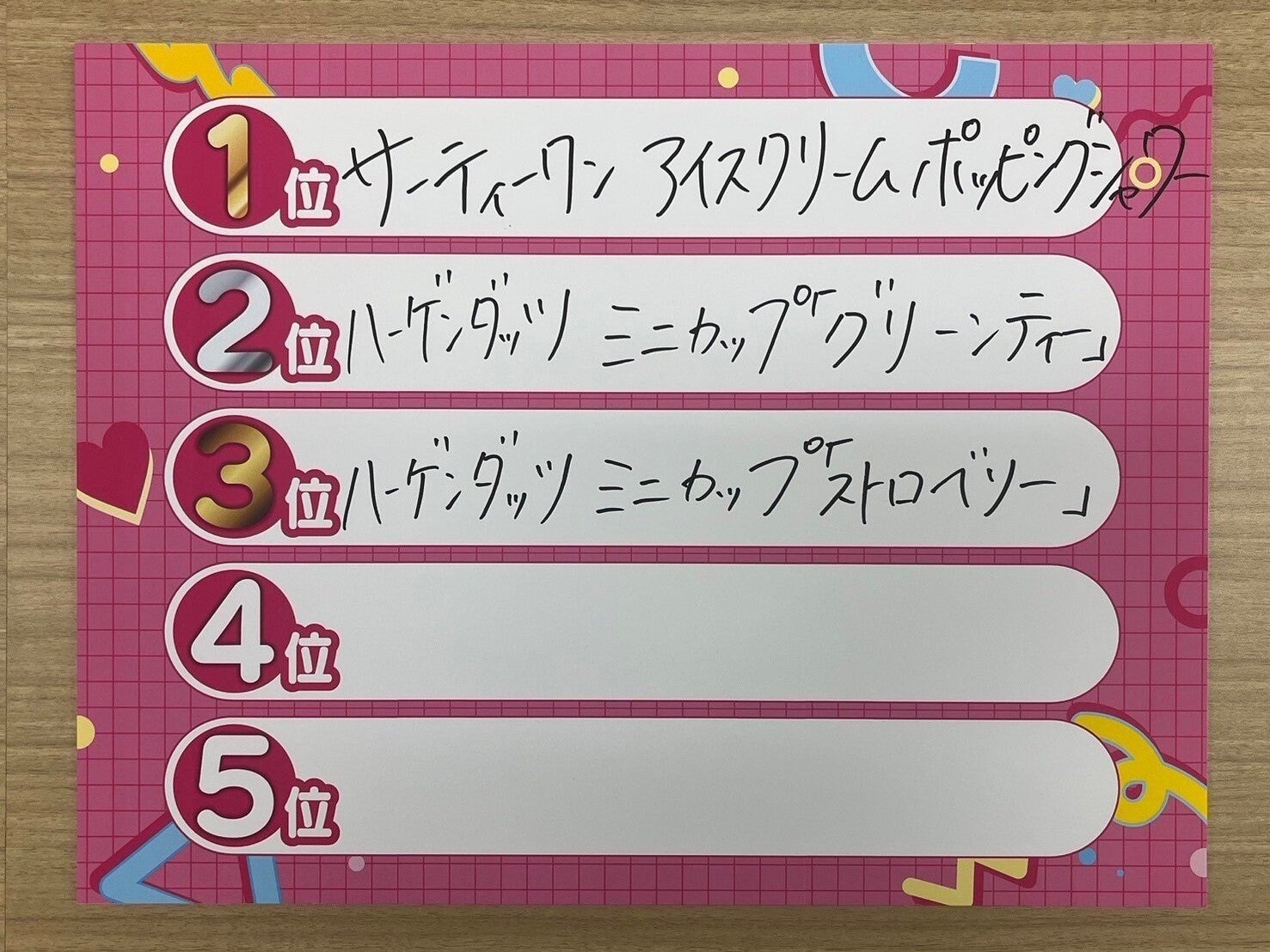 トップ5は、フジコーズのメンバー16人がそれぞれトップ3を発表し、1位が5点、2位が4点、3位が3点の総合点で決まった。番組ではトップ5に入らなかったが、メンバーの上西萌々が1位に挙げた「やわもちアイス わらびもち」を試食していた。
