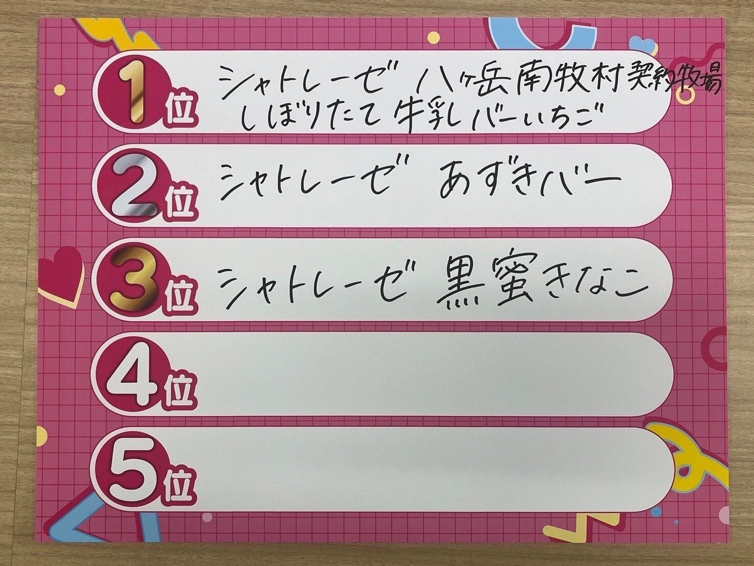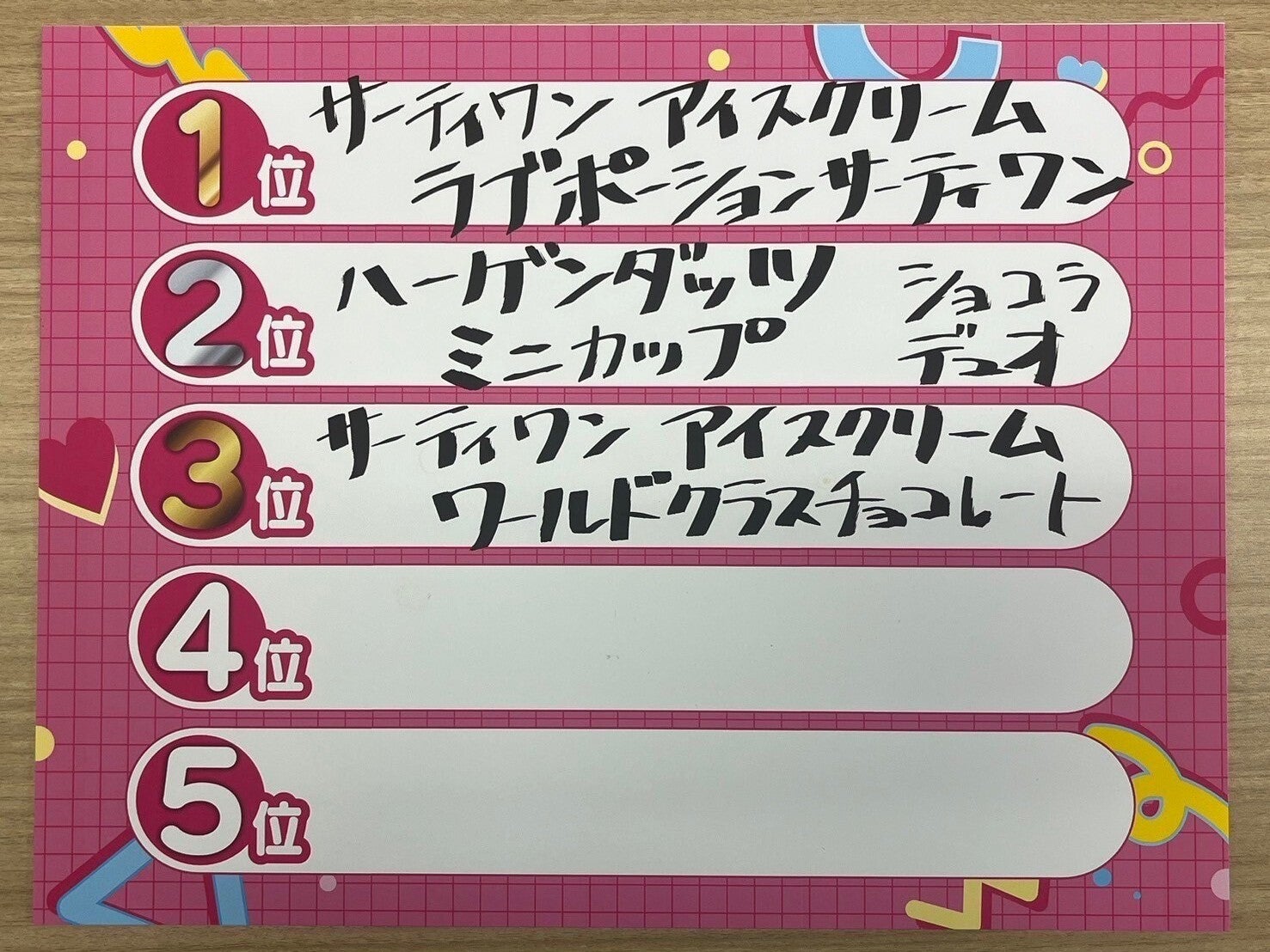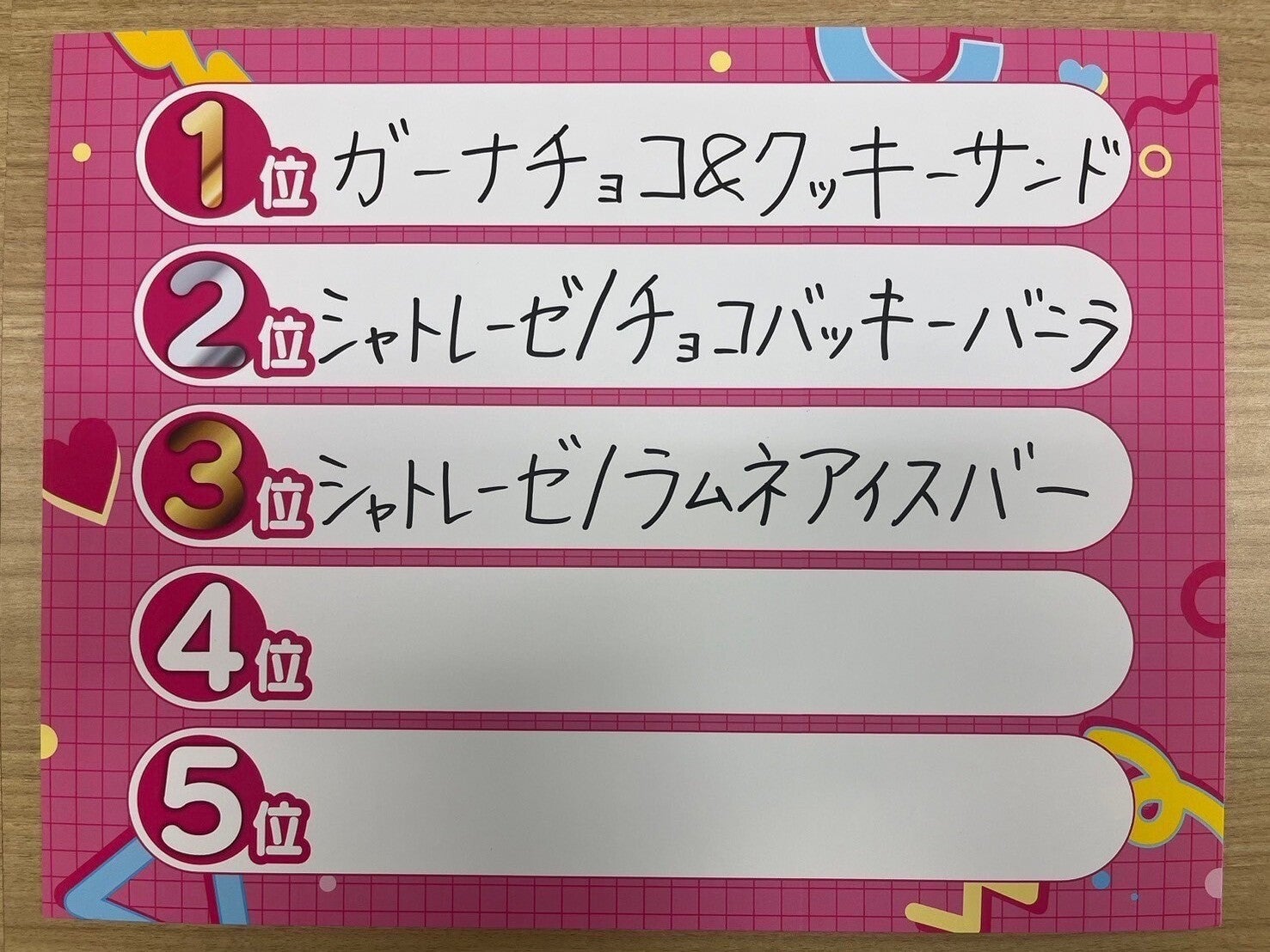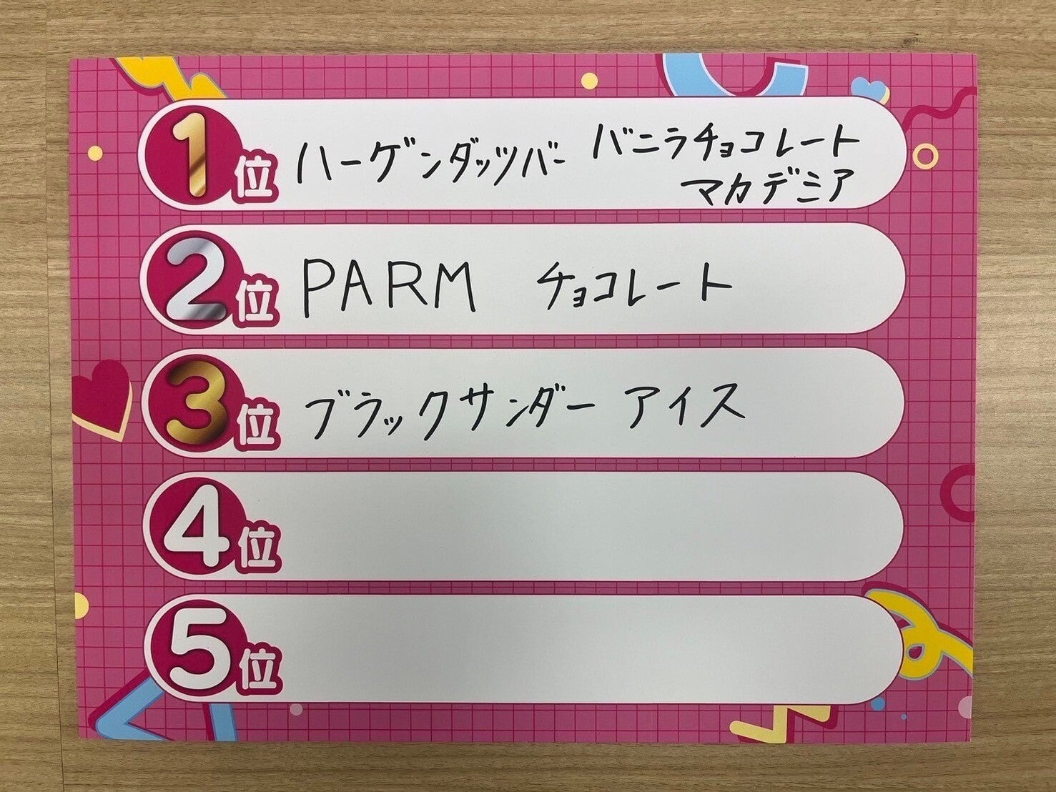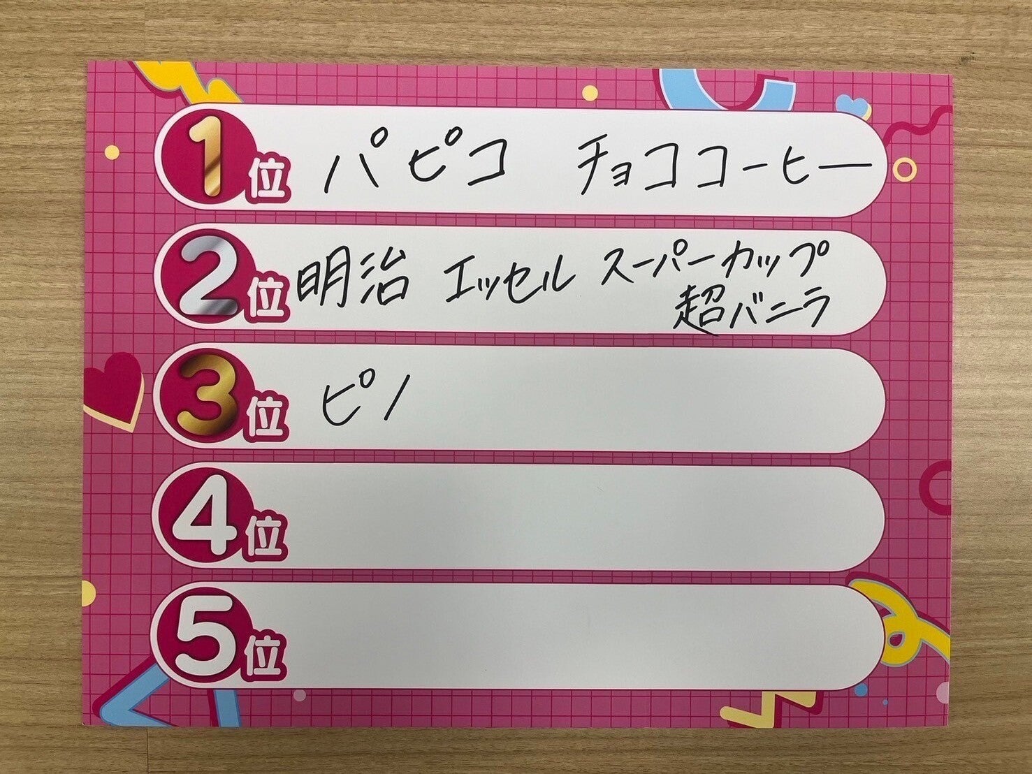 トップ5は、フジコーズのメンバー16人がそれぞれトップ3を発表し、1位が5点、2位が4点、3位が3点の総合点で決まった。番組ではトップ5に入らなかったが、メンバーの上西萌々が1位に挙げた「やわもちアイス わらびもち」を試食していた。