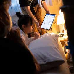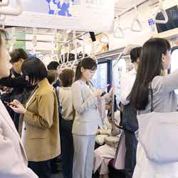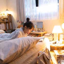 グレーのスーツを身に纏った山下は、満員電車に揺られながら撮影に挑んだ。外を眺めて笑顔を見せ、カメラに気づくと手を振るような素振りも見せていた。改札のシーンでは、タッチに失敗して改札から出られず、思わず笑ってしまう場面もあったが、3時間も巻いて撮影が終了。「3時間も巻いています」と3本指を立ててポーズしながら、嬉しそうに話した。続くコンビニシーンの撮影も難なくこなし、夜の自宅撮影に。ゆるいお団子にパジャマ姿の山下が、寝転びながら日記を書いて、眠りに落ちるシーンを演じた。会社のシーンでは、リモート打ち合わせを行ったり、ランチタイムを楽しんだり、会社員を楽しんでいる様子も伺えた。