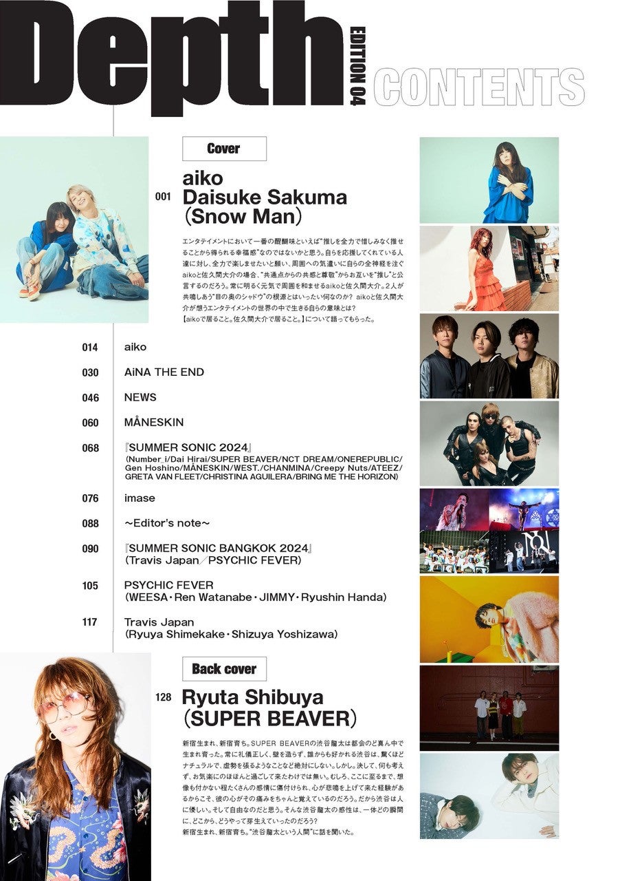 自らを応援してくれている人達を全力で楽しませたいと願い、周囲への気遣いに全神経を注ぎ、常に明るく元気で周囲を和ませるaikoと佐久間。2人が共鳴しあう“目の奥のシャドウ”の根源とは何なのか。それぞれが歩いて来た道のりの中で感じてきた心の奥にしまった想いを明かす。「aikoで居ること。佐久間大介で居ること。」について語った音楽誌初コラボレーションとなるインタビューを、計17,000字で掲載する。裏表紙&巻末特集にはSUPER BEAVER渋谷龍太が登場