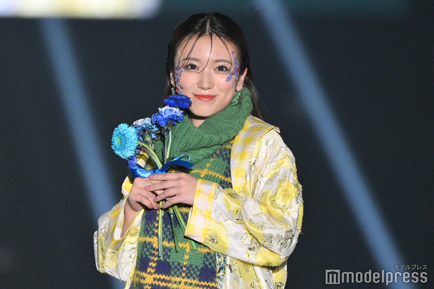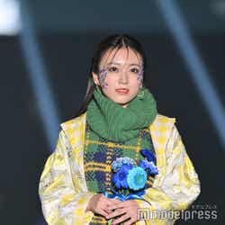 緑のチェックニットと花柄のミニスカート、黄色のロングコートに身を包んで登場した矢吹。顔にはブルーの花とアイメイクが施され、手にも花束が。レースタイツからは美しい脚が透けていた。「TGC北九州」8回目の開催