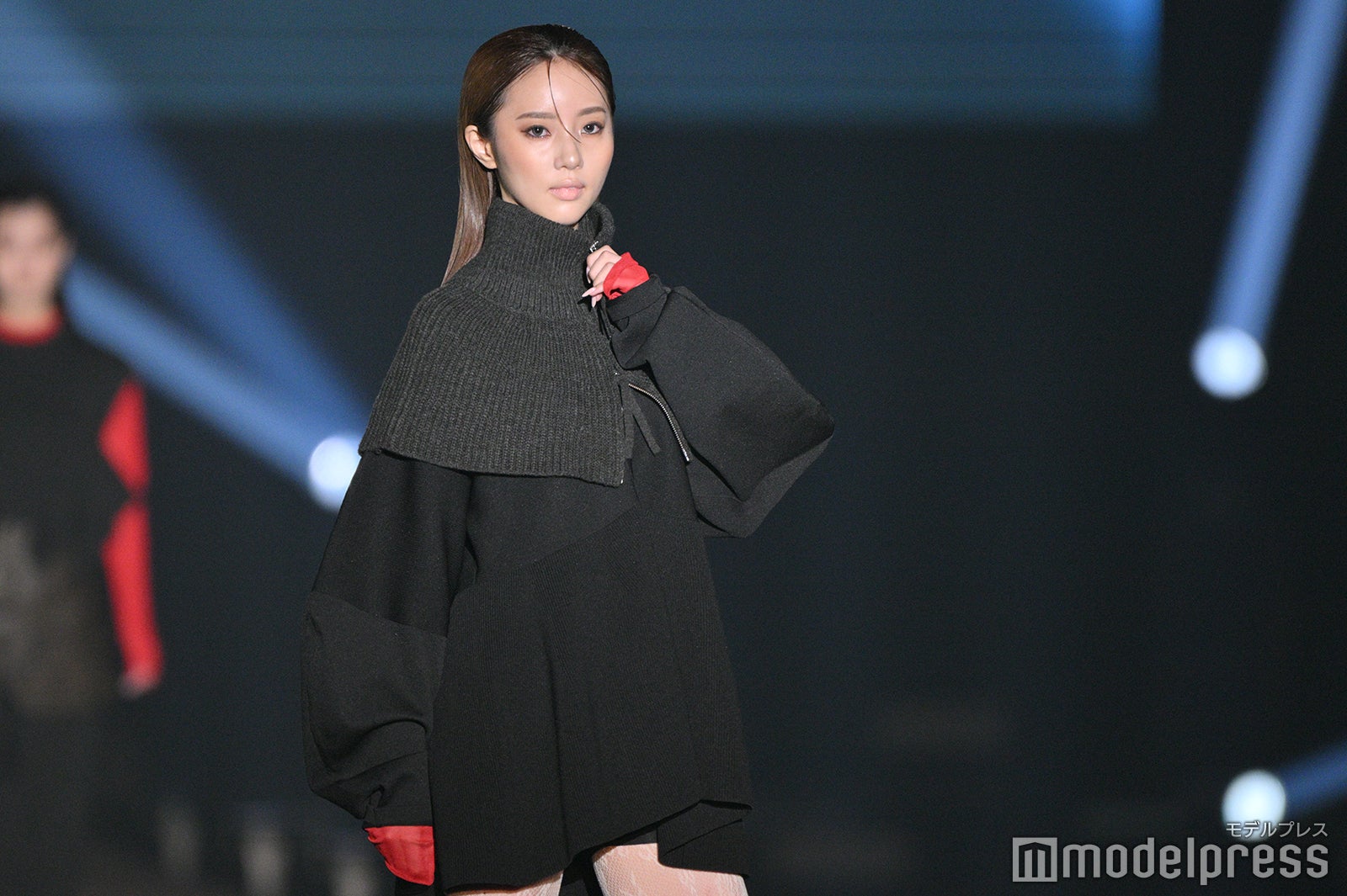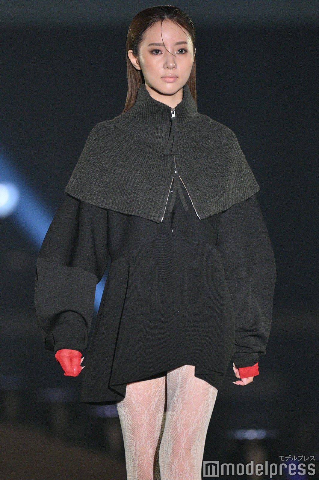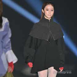 黒のミニワンピースにグレーのニットつけ襟を身に着け登場した中町。レースのタイツを着用した美しい脚を披露した。「TGC北九州」8回目の開催
