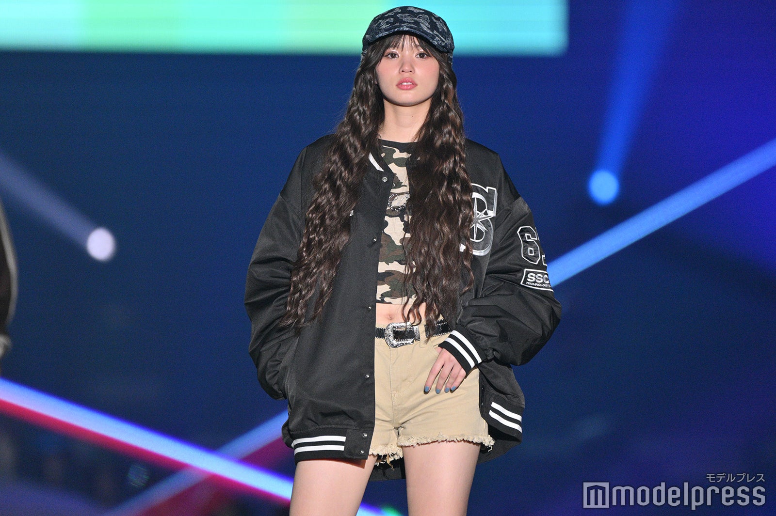 迷彩柄のショート丈トップスにショートパンツ姿で圧巻の美脚を披露した原田。引き締まった美しいウエストものぞかせた。「TGC北九州」8回目の開催