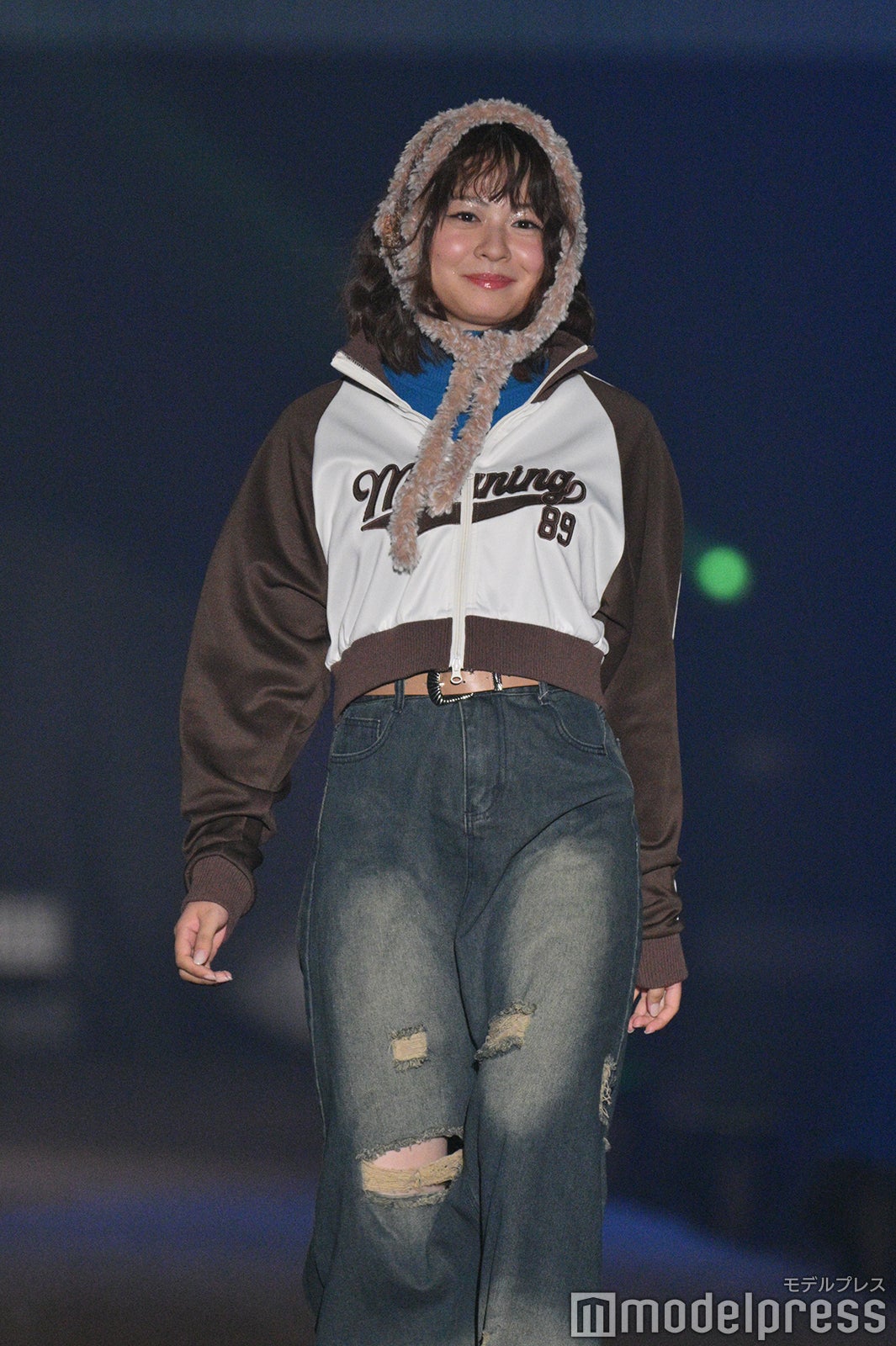 莉子は、ベージュのボアが可愛らしいアイテムがアクセントとなった冬らしいコーディネートを披露。大胆なロゴがキュートなジップアップにデニムを合わせ、カジュアルなスタイリングでランウェイを歩いた。「TGC北九州」8回目の開催