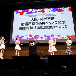 続いて、関西出身の柔道家、一二三と詩、スペシャルサポーターのくまモンと、キティちゃんが登壇。ゆうちゃみ・ゆいちゃみ姉妹と一二三・詩兄妹による『大阪・関西万博来場日時予約キックオフ記念兄妹対抗!早口言葉チャレンジ』が行われた。「来場日時予約」をキーワードに使用した早口言葉のお題に対して、噛まずに言えた場合は一本、判定が悩ましい場合は技ありという柔道風のルールで、判定はくまモンと、キティちゃんが行なった。