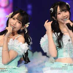 落合希来里はシャツにネクタイ、黒のアウター、美しい脚が際立つミニ丈スカートを合わせたスクールガール風のコーディネートで登場。永田詩央里はオーバーサイズのシャツにカラーニット、デニムジャケットのカジュアルな重ね着スタイルで、クールなランウェイを披露した。