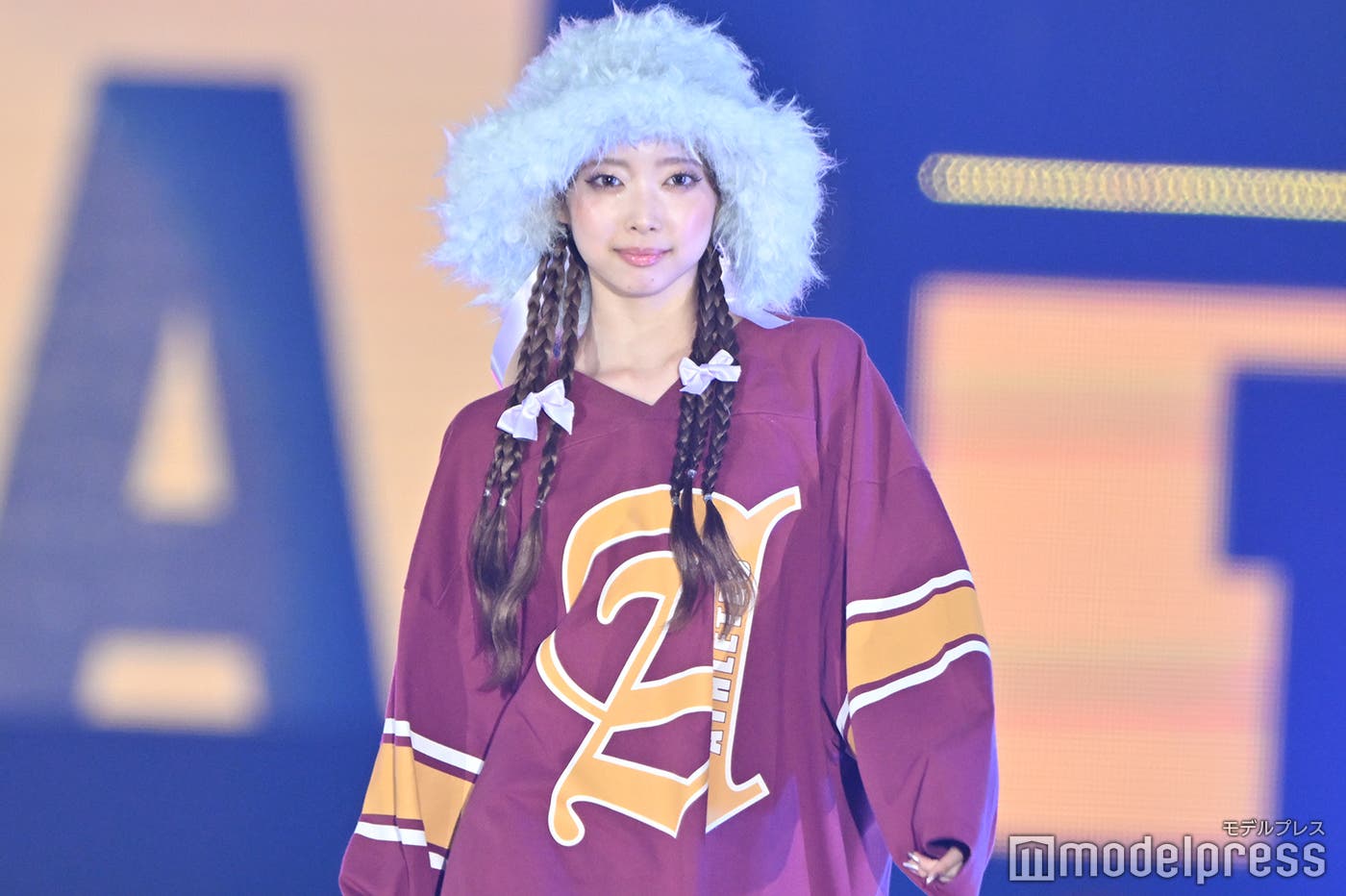 田中はワインレッドのスウェットワンピースの下に同系色の透け素材スカートをレイヤードした秋ファッションで登場。ロングヘアを三つ編みアレンジでまとめ、大きなファーの帽子が目線を奪った。また初ランウェイとは思えぬ堂々としたウォーキングとポーズで観客を魅了した。「ガルアワ2024 A/W」テーマは「Neo Future Lab」
