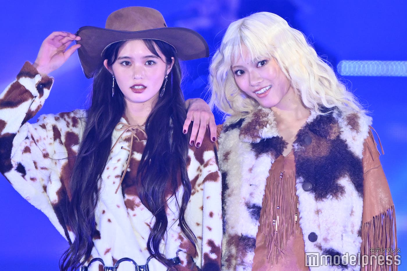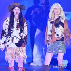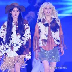 原田は、カウボーイハットにボア素材のパーカー、鶴屋はフリンジ素材のトップスにボアベストを羽織ったウエスタン風のコーディネートで登場。ミニスカートからはスラリと伸びた美しい脚を披露した。ランウェイトップでは鶴屋が原田の肩に手を置き、顔を近づけポーズ。長年同じグループで活動してきたからこその息ぴったりのウォーキングを見せ、観客を釘付けにしていた。