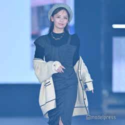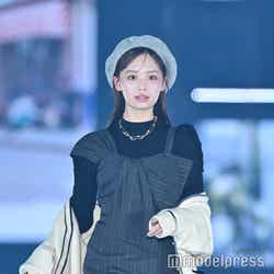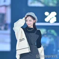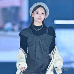 9月18日発売の12thシングル『絶対的第六感』の活動をもって、日向坂46を卒業することを発表している濱岸。黒のトップスに胸元にリボンをあしらった変形キャミソールワンピースを重ねたコーディネートで登場した。ワンピースに入ったスリットから美しい脚をちらりとのぞかせた濱岸。ランウェイトップでは、ベレー帽を押さえ余裕の笑みを浮かべていた。