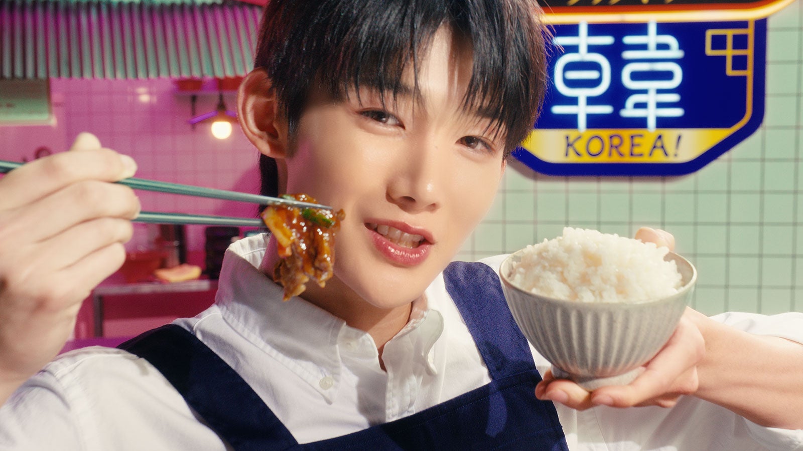 思わずドキッとするほどカメラのすぐそばまで近づいて、完成したメニューを笑顔で紹介する様子や、幸せそうな表情で韓国料理を味わう姿を見ることができる。