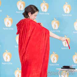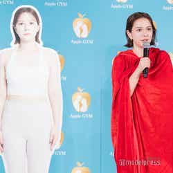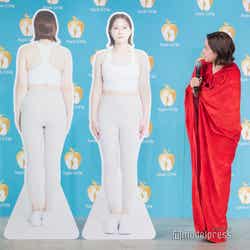 その後、マントを外し、ボディメイクの成果をお披露目。無数のシャッターを浴びた村重は「お尻とかちょっとキュッとして、スタイリッシュな感じになりました」と胸を張った。ウエストのサイズに関しては、まずは自己流のダイエットでマイナス2cm、その後、「Apple GYM」でのボディメイクでさらにマイナス7.5cmと、合わせてマイナス9.5cmを達成。ヒップはマイナス3cm、太もも周りはマイナス2.5cmのボディメイクに成功したという。