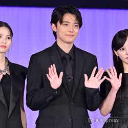 2020年に「週刊ヤングジャンプ」(集英社)にて赤坂アカ氏と横槍メンゴ氏の共同名義で連載スタートした『【推しの子】』。伝説的アイドル・アイの“推しの子”として転生するファンタジックな設定とショッキングな描写もいとわないサスペンス要素、そして芸能界という複雑な世界に躊躇なく切り込む他に類を見ない斬新なストーリーが注目を集めた。コミックス累計発行部数1800万部以上した人気作が、ついに初の実写化。Amazonと東映が手を組み、日本が誇る人気作を世界に届ける。主演を務めた櫻井は、母であるアイの死の真相を暴くため芸能界に潜り込むアクアを演じた。もともと原作の大ファンで「アクアは自分以外にやらせたくない」と直談判したほど。「もし実写化するならアクアをやりたいと思っていた。そしたらオファーをいただけて光栄だった」と笑顔。続けて「現場に入ってからは、これだけ人気の作品を実写化するのは最大限の愛とリスペクトを持って接しなければいけない。常に、アクアが演じるシーンで原作ではどう立っているのか、どうセリフを言い回ししているのか、毎回確認しながら再現性を追求する毎日だった。プレッシャーもあったけど、現場に入ってからは、決して一人で戦っているわけでなく、組全体で作品に愛とリスペクトを持って向かっている感覚があった。プレッシャーよりも早く届けたい気持ちに切り替わった」と現場を振り返った。