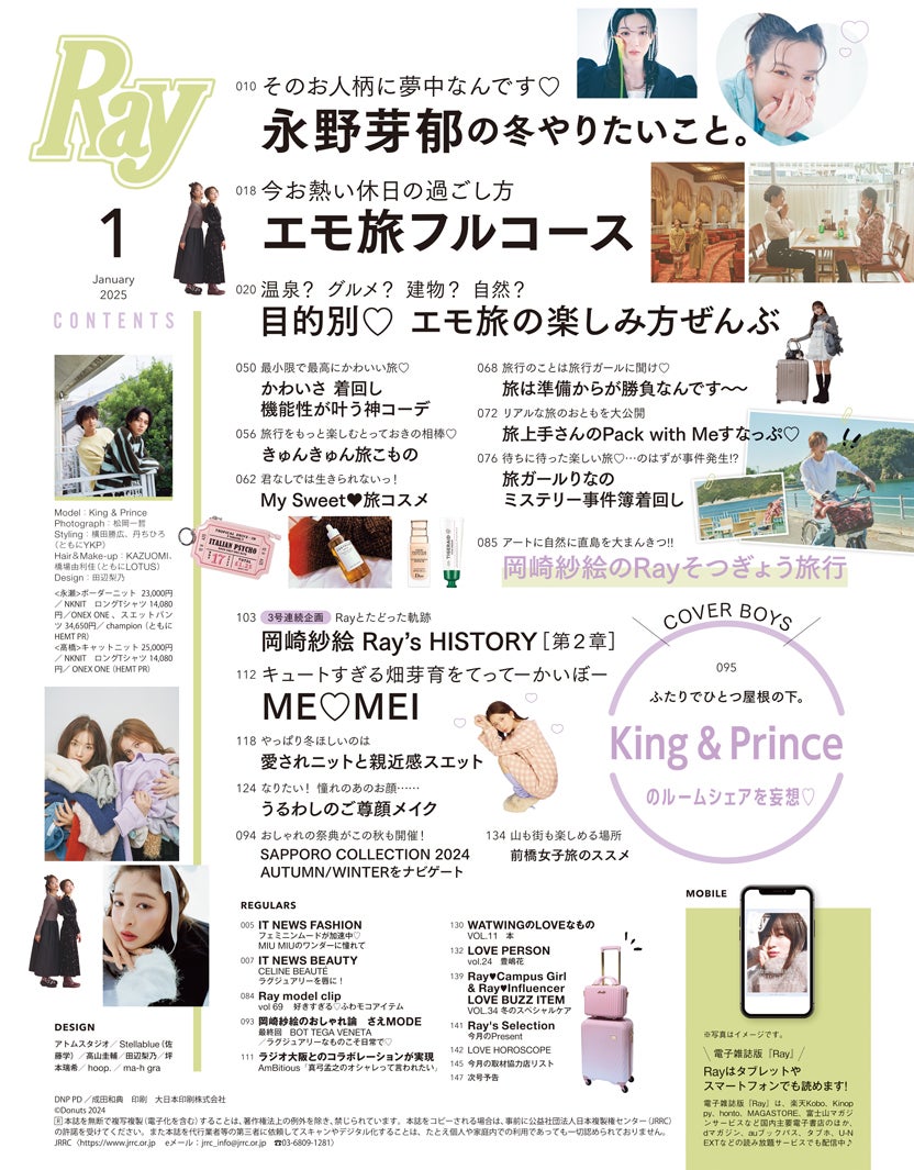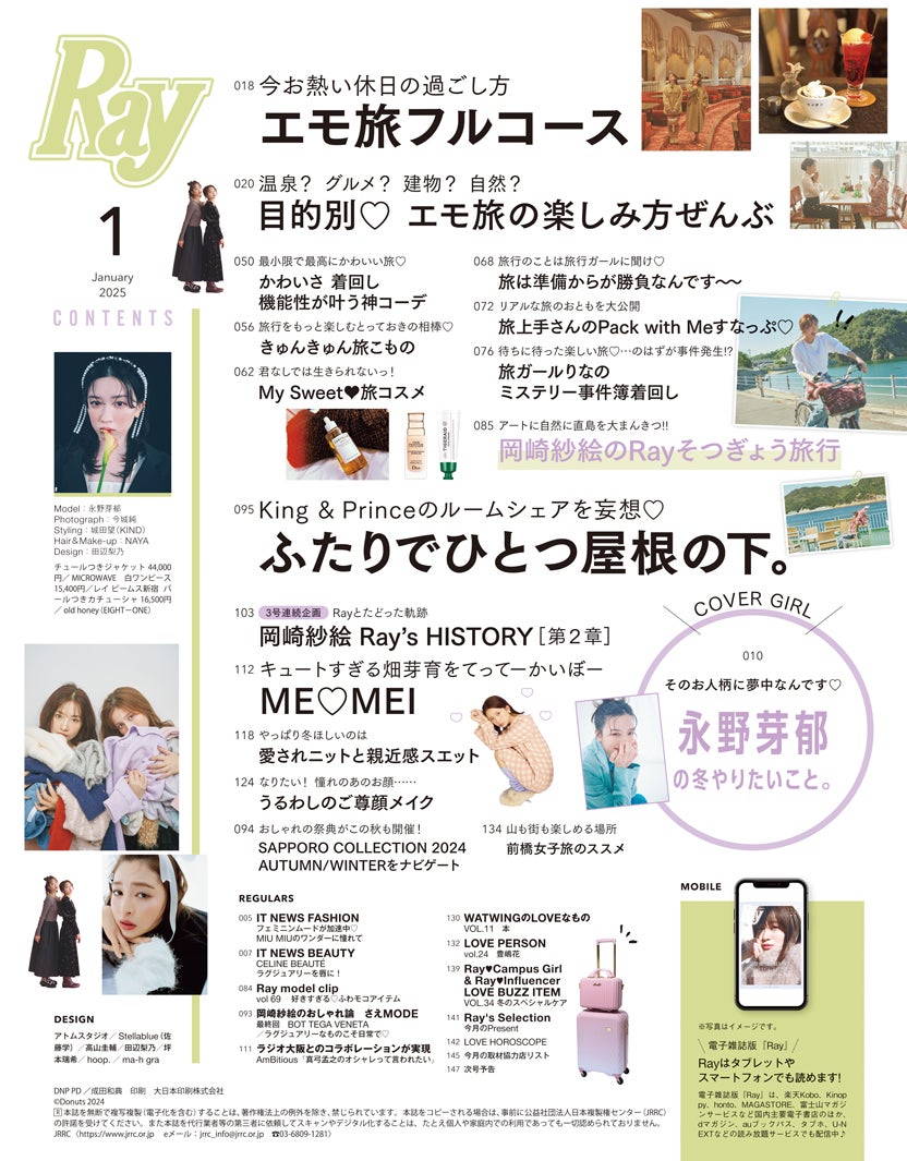 女優の永野芽郁が、11月22日発売の女性ファッション誌「Ray」1月号(発⾏元:株式会社DONUTS/発売元:株式会社主婦の友社)の通常版表紙に登場。モノトーンのプリンセスコーデを披露している。あ