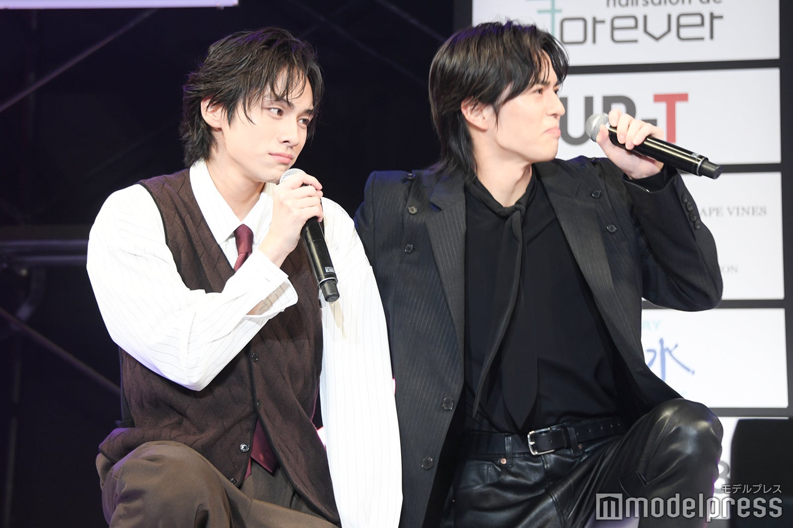同コンテスト出身の2人は、歴代ジュノンボーイステージに登場。奥野は「クリスマス」「沈みそうな船の上で」「敵と戦いながら必死な感じで」、山下は「授業をサボり中」「バイト先で」「ツンデレな態度」のお題に沿って即興ドラマを展開した。奥野の告白ドラマは、山下を守りながら敵から逃げている様子を演じつつ、「俺は幸輝のことが好き」と告白。山下も「俺も壮が好き」と映画「タイタニック」の有名シーンを真似て、最後には奥野が山下をバックハグする形となった。