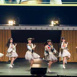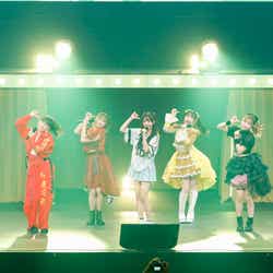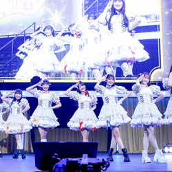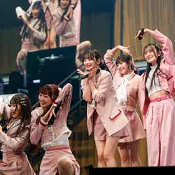 ほかにも、同公演ならではの特別な企画は続いていく。シャッフルユニットブロックでは、MISS PARTYによる「Summer Rays」、BREAKFAST GIRLS(朝食少女)の「Chewing gum」、TEAM JOSHIの「恋人はスナイパー」という1回限りのカバーコラボが次々と会場を盛り上げる。それぞれがオリジナルグループの衣装で登場、ふだんは見ることができない、新鮮な姿を見せた。さまざまな要素で盛り上がったライブもいよいよ終盤戦へ。ここで、ファンにとってはたまらないもう1つの目玉企画、撮影可能タイムメドレーがスタート。各グループの代表曲が10分近くメドレーで流れる中、メンバーはアリーナからスタンドまで会場内を練り歩きながら、思い思いのファンサービスでファンの撮影に応えていった。